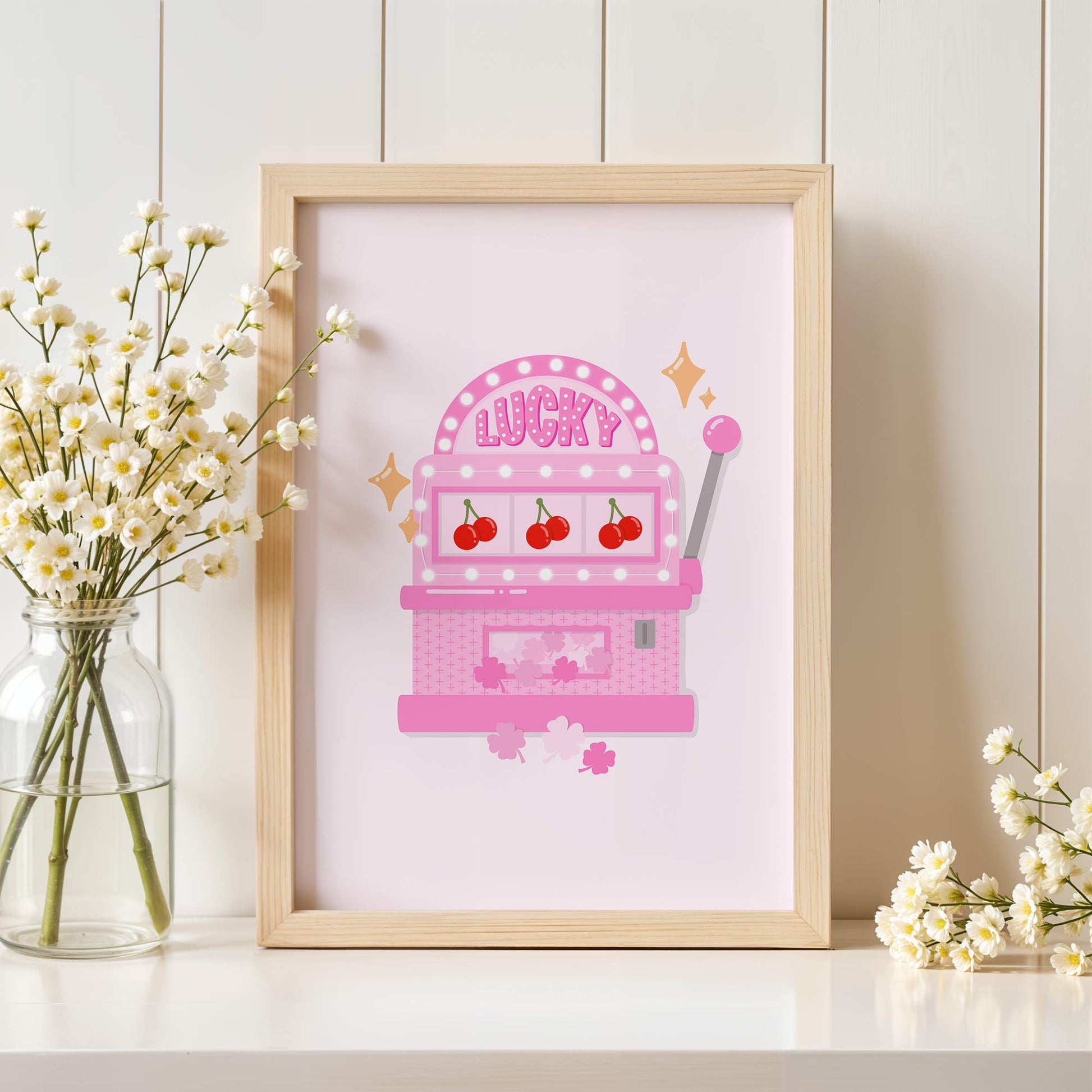 This Lucky Slots Machine art print is a bold and playful illustration designed to bring fun, colour, and good fortune to your space