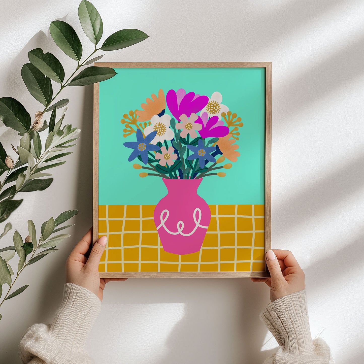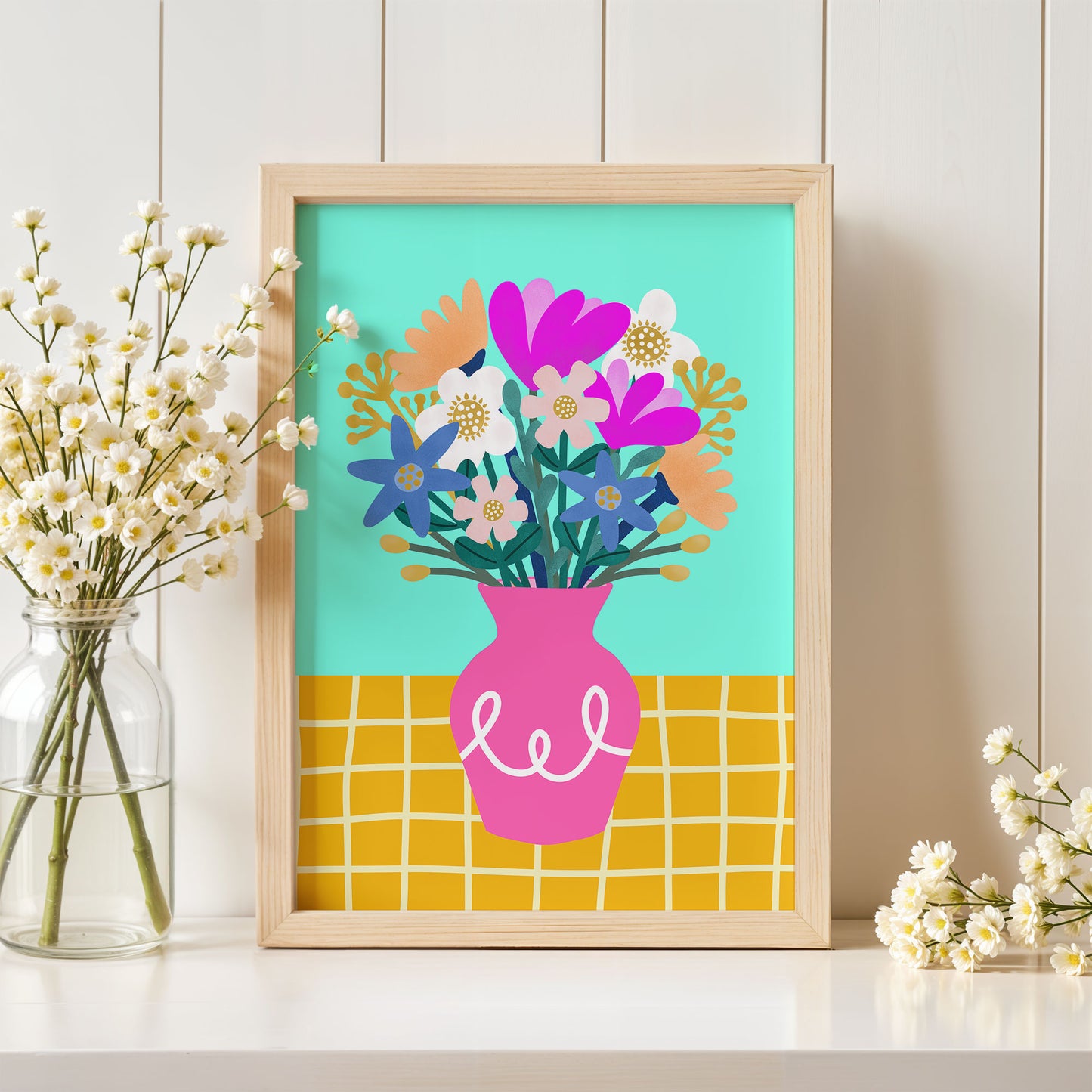 A beautiful illustrated Pink Vase of Flowers Art Print. An art print that will bring a gorgeous pop of colour to your home or office.