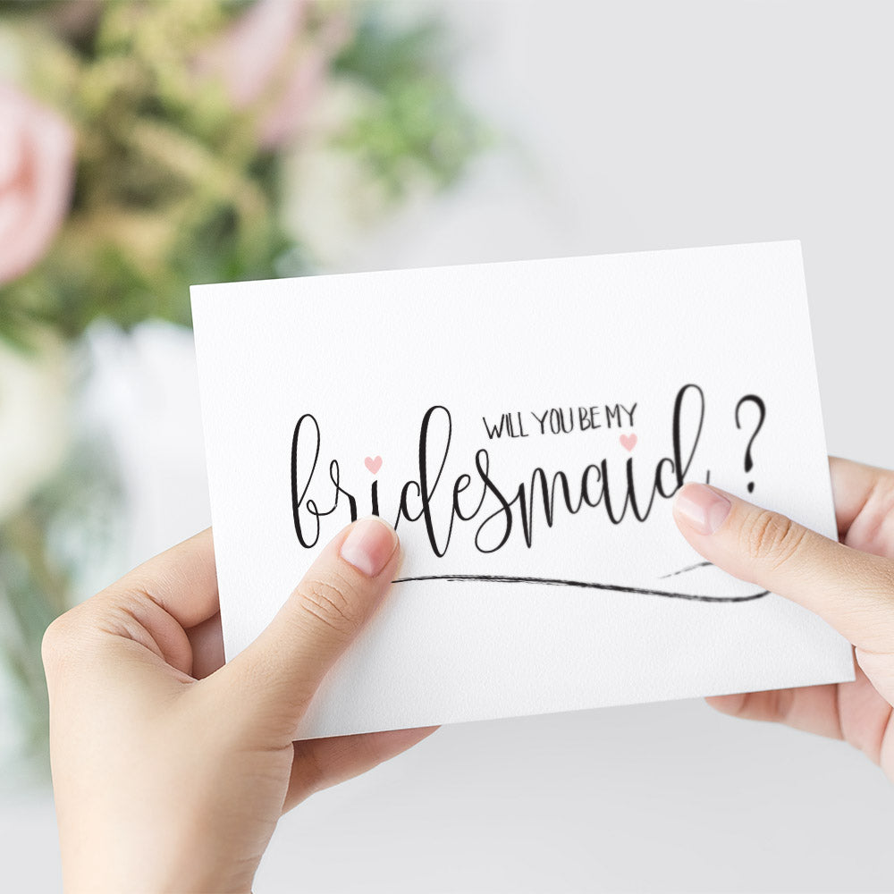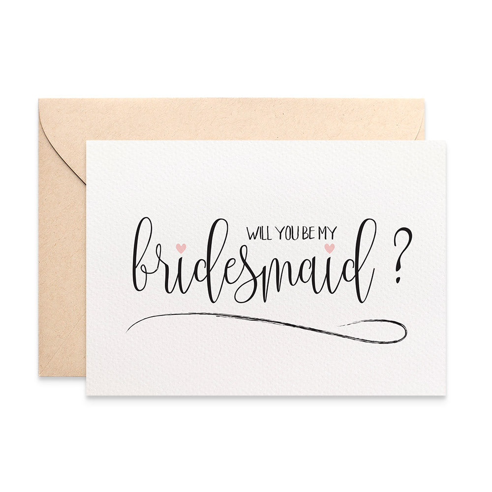 A stylish Will you be my ? Handmade Wedding Card featuring a beautiful script font with a pink love heart for that very special occasion.