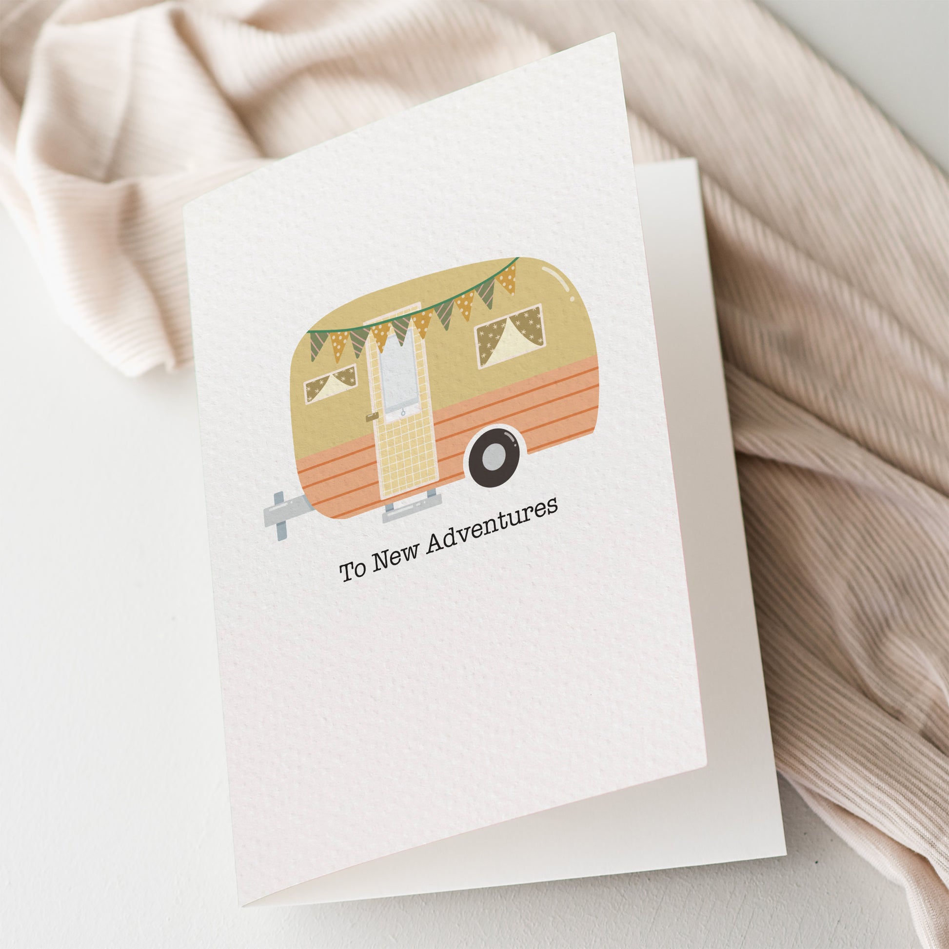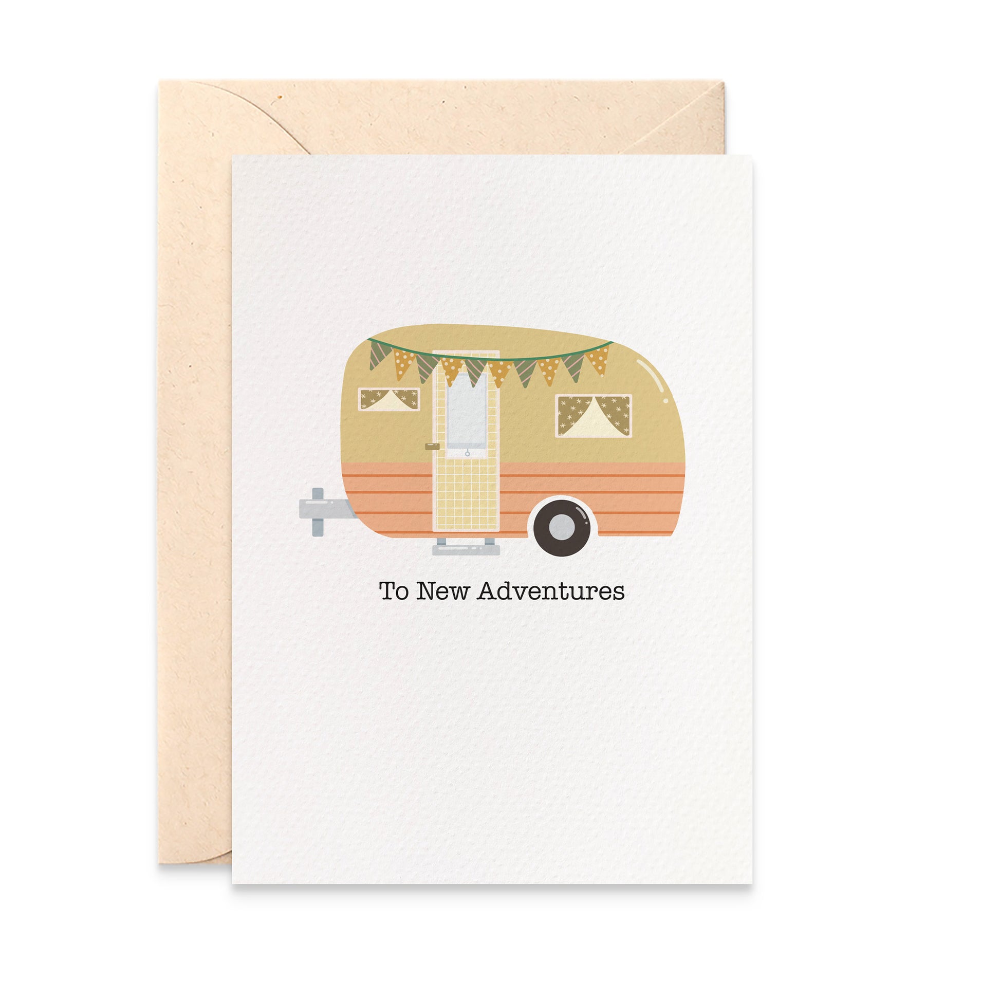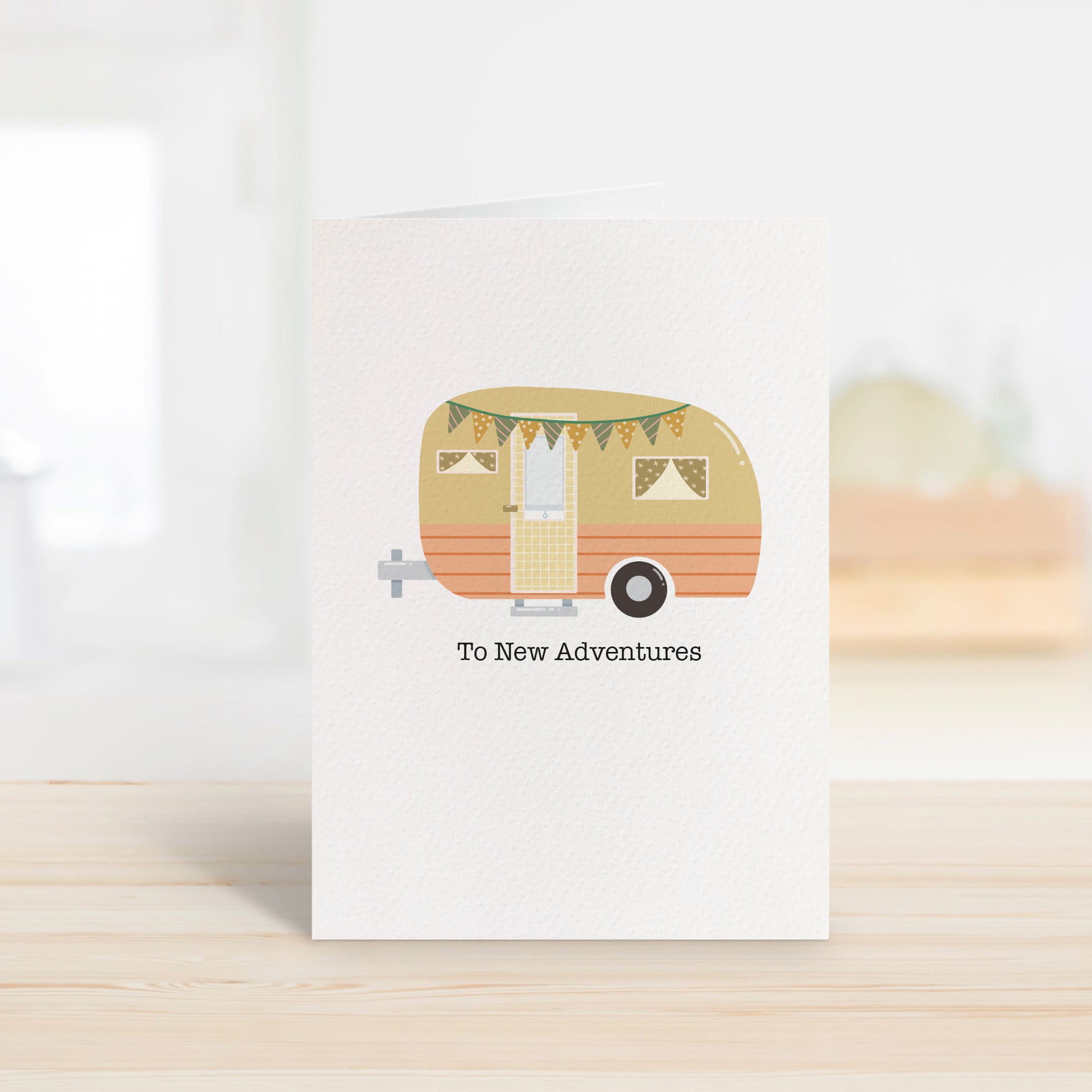 A sweet and hopeful card featuring a charming camper and bunting, perfect for celebrating new beginnings and life’s next adventures.