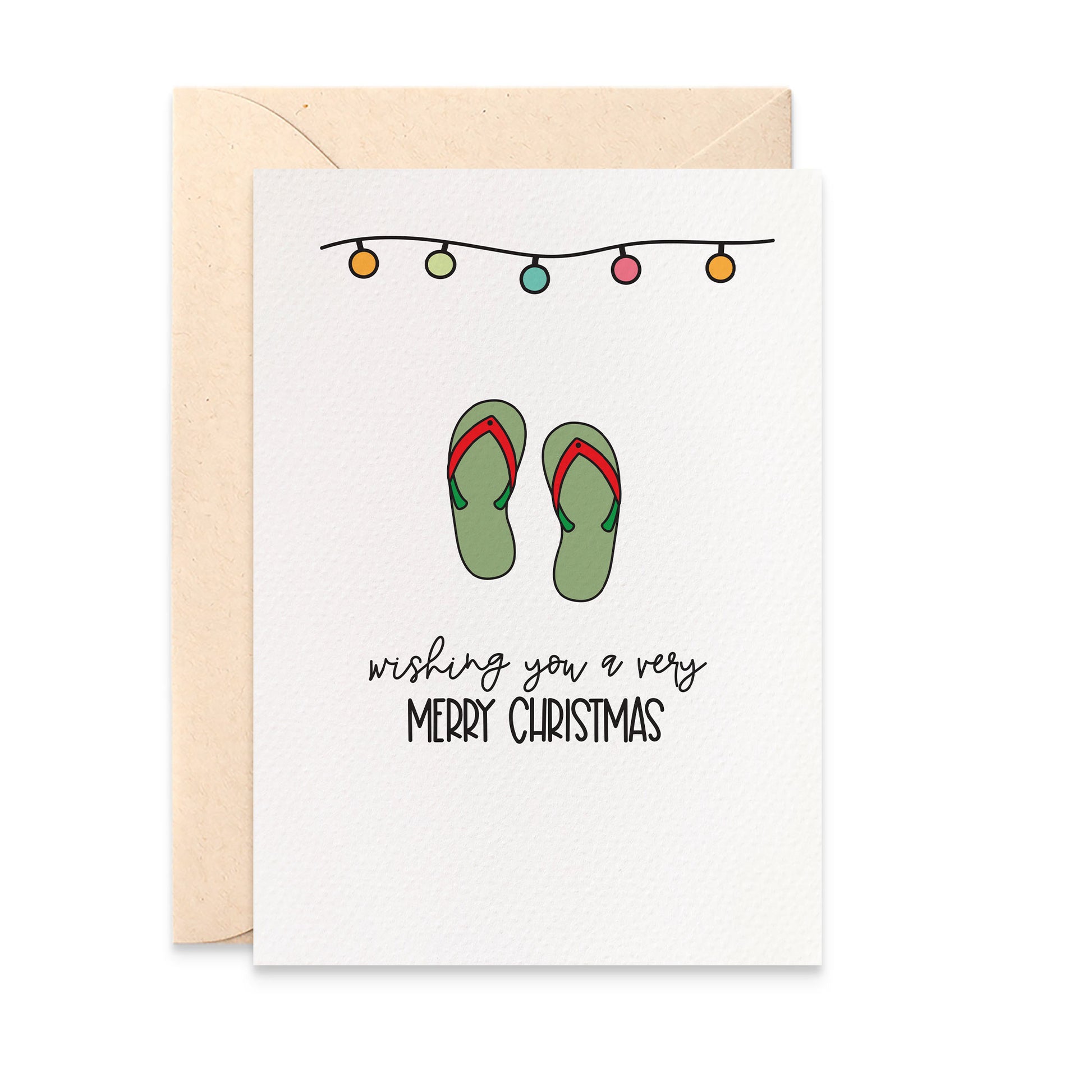 A fun handmade Australian Themed Christmas Card featuring Aussie Thongs and the words Wishing you a very Merry Christmas. An fun card to celebrate this wonderful time of the year especially to friends and family overseas.