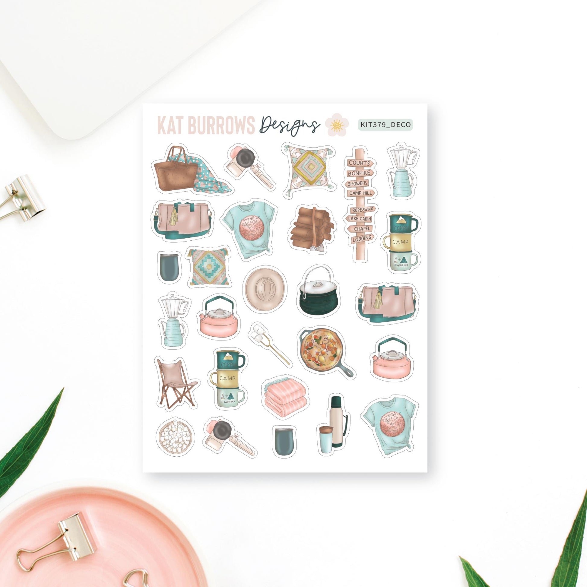 Stylish planner stickers featuring an Adventure Awaits Camping theme. These stickers are perfect for planners such as Erin Condren, Happy Planner, Kikki K etc.