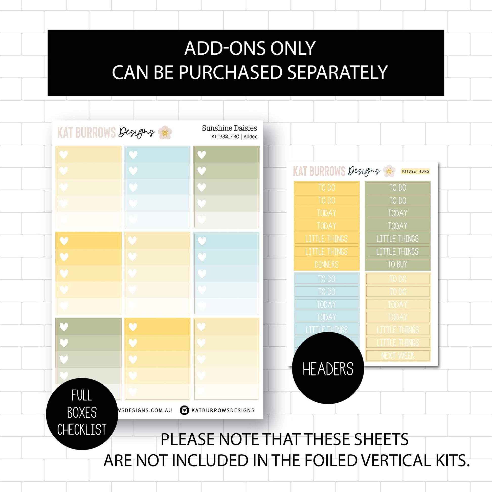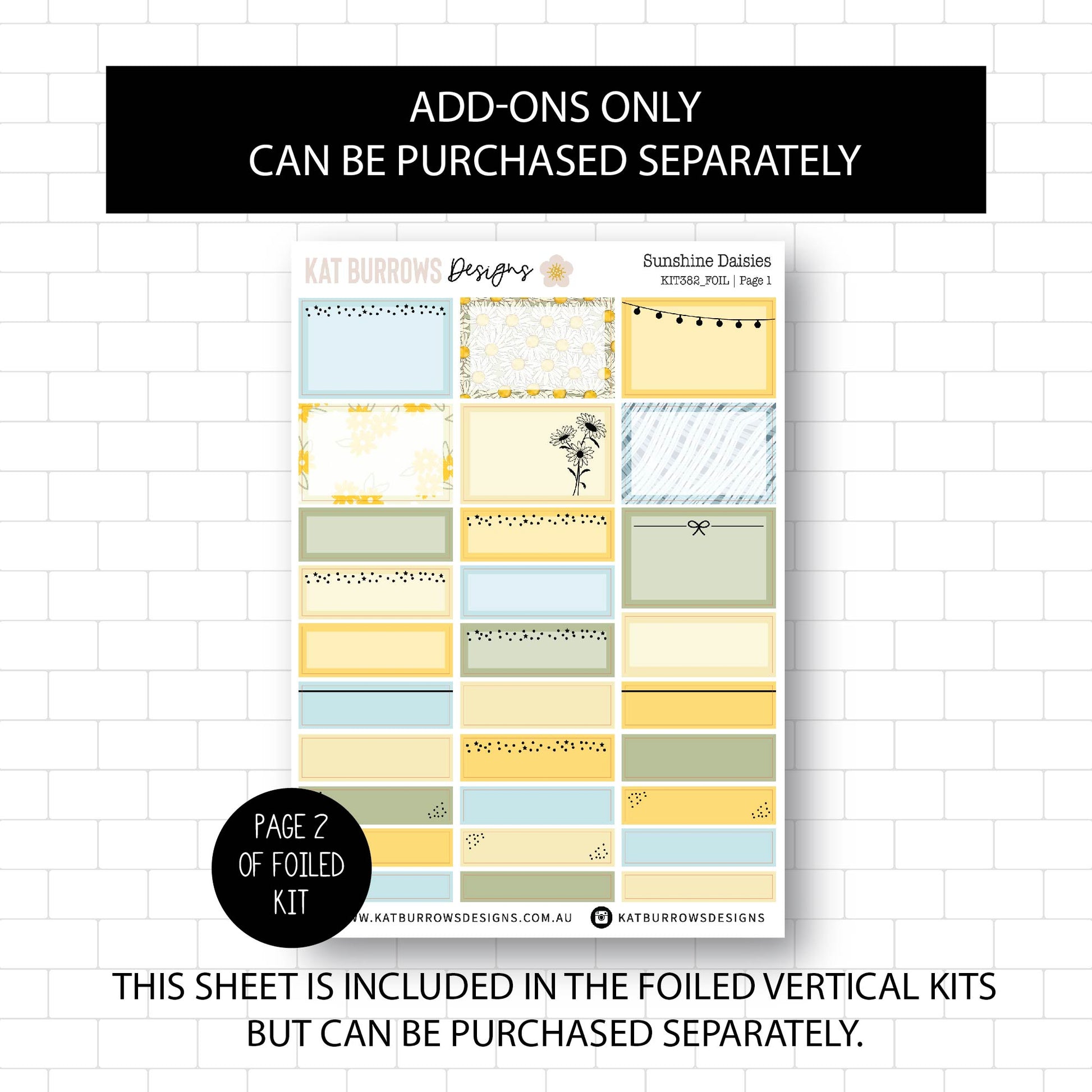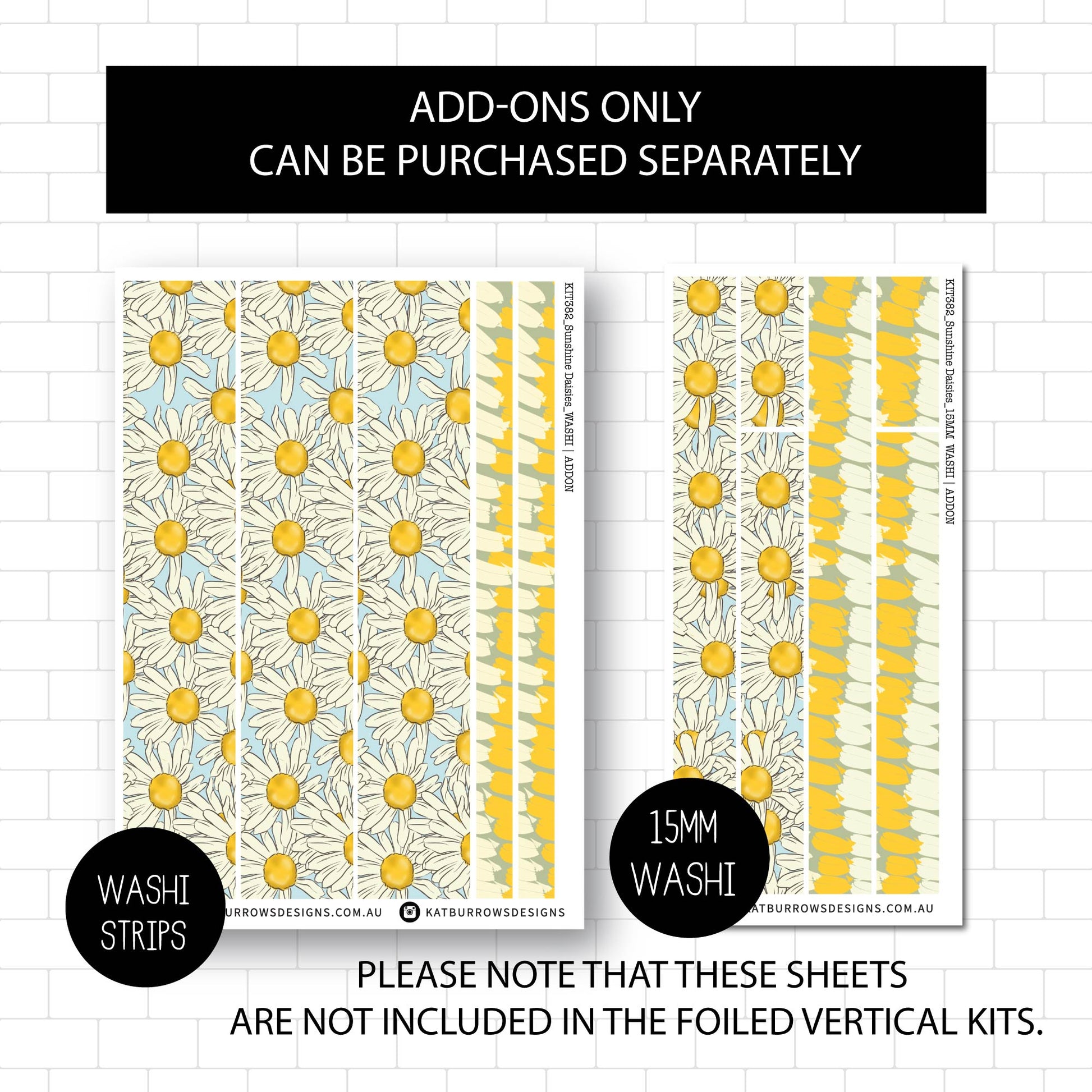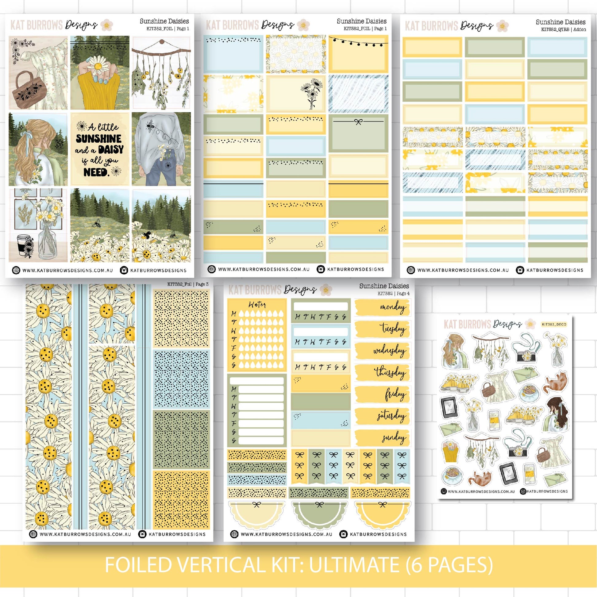 A beautiful foiled Vertical Sticker Kit featuring a Sunshine Daisies theme. These foiled planner stickers are perfect for planners such as the Vertical Erin Condren Planner, The Happy Planner, Kikki K etc.