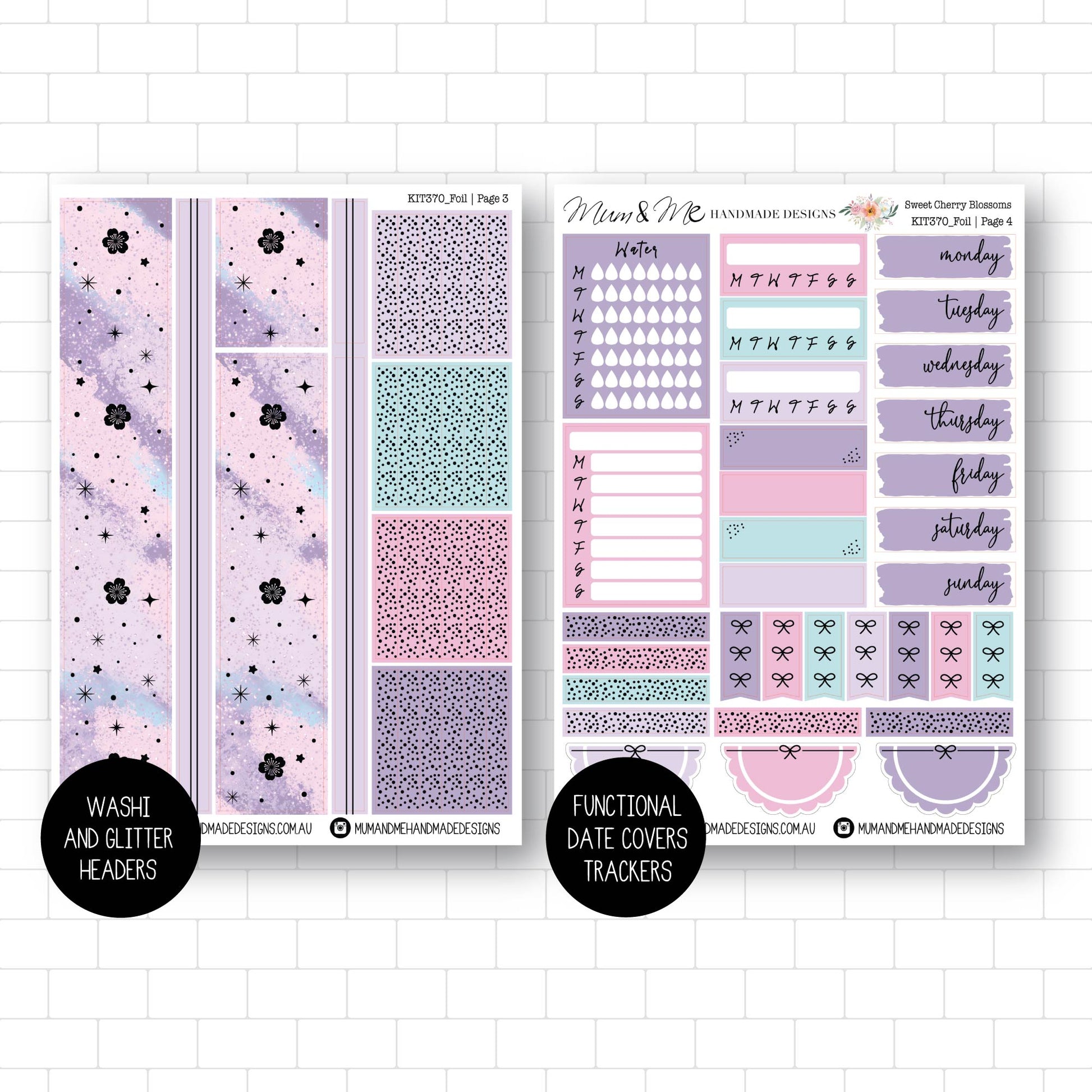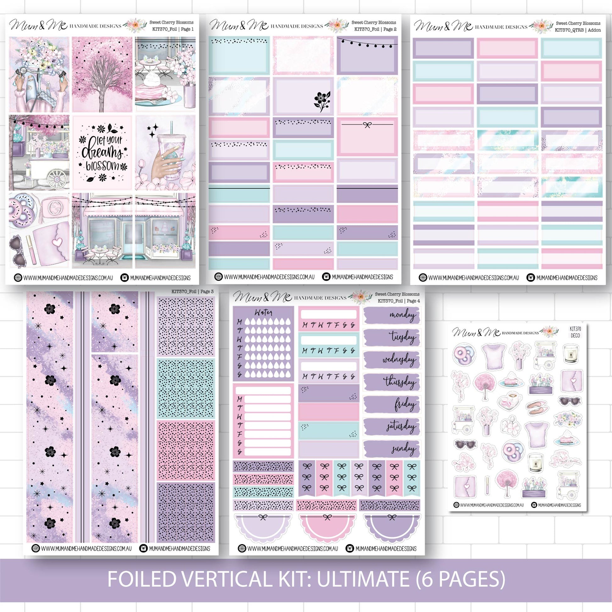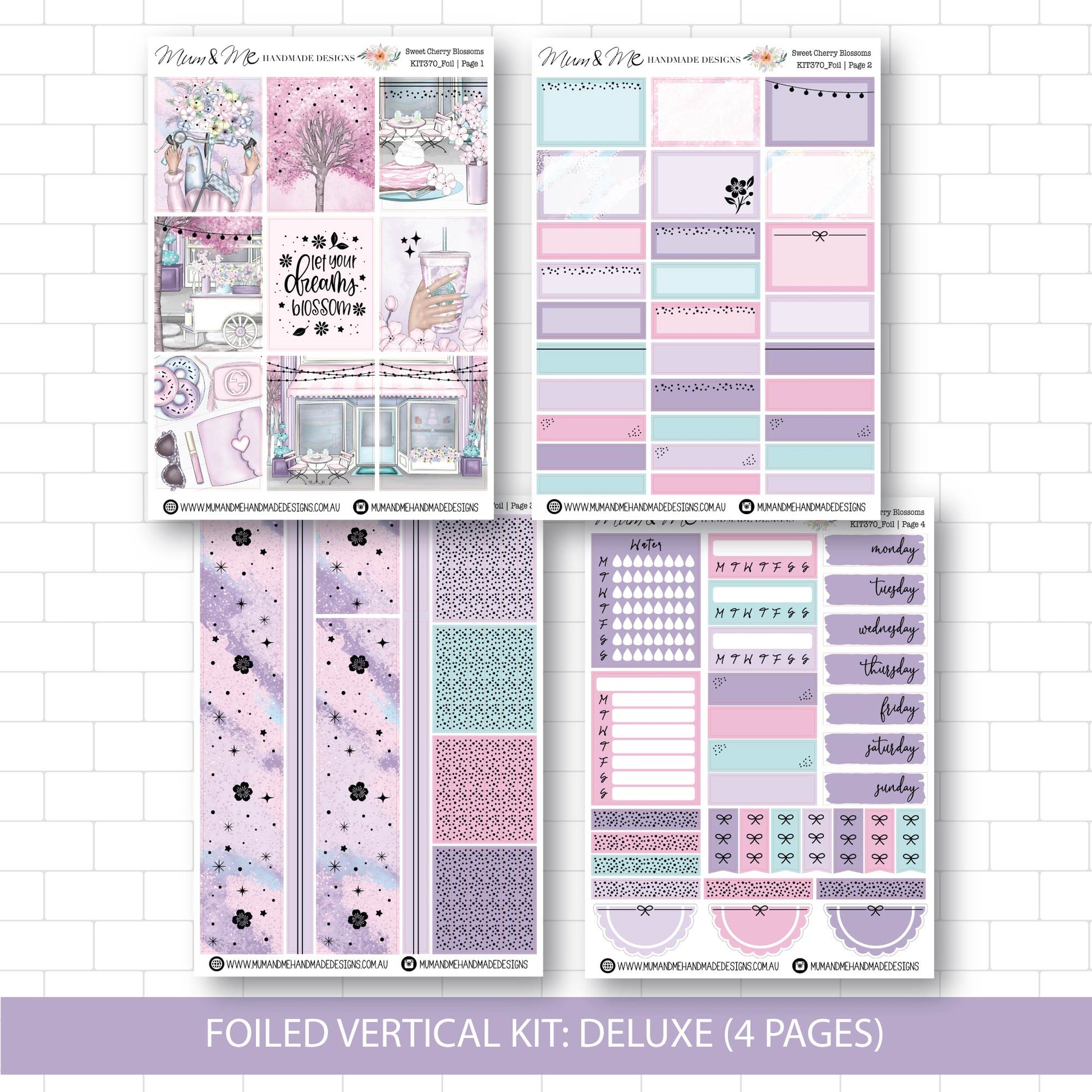 A beautiful foiled Vertical Sticker Kit featuring a Sweet Cherry Blossoms theme. These foiled planner stickers are perfect for planners such as the Vertical Erin Condren Planner, The Happy Planner, Kikki K etc.