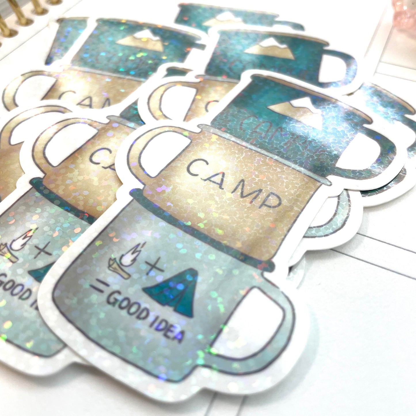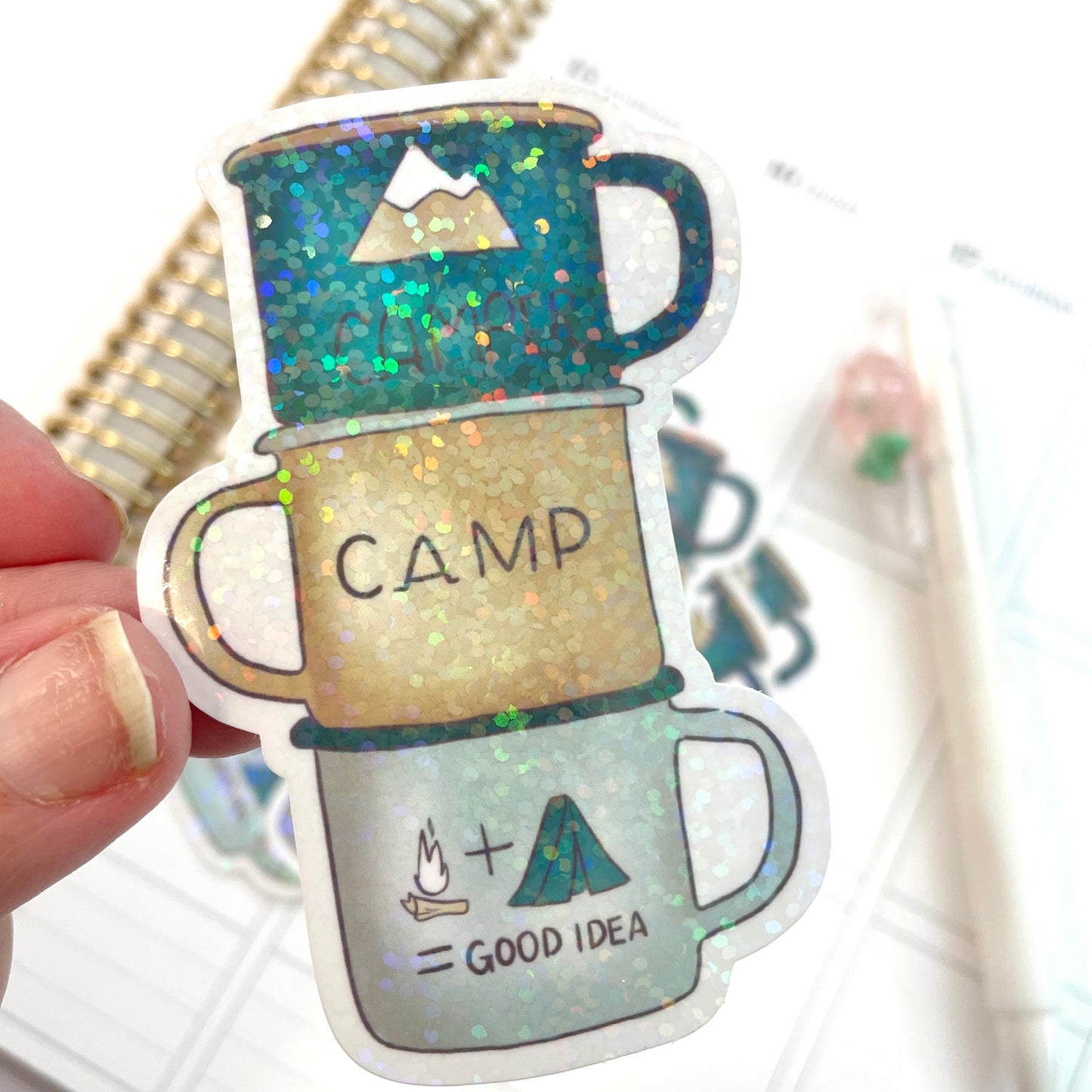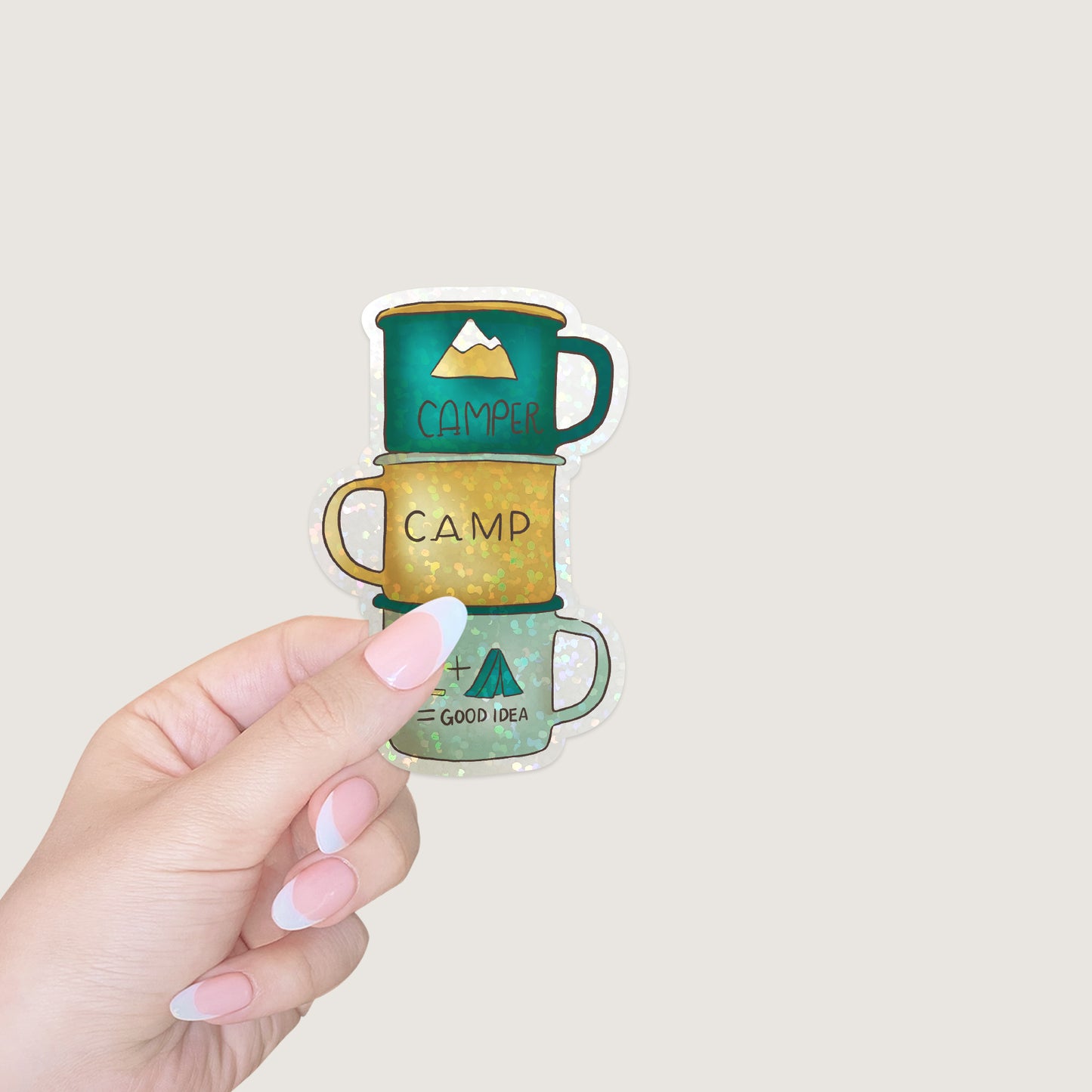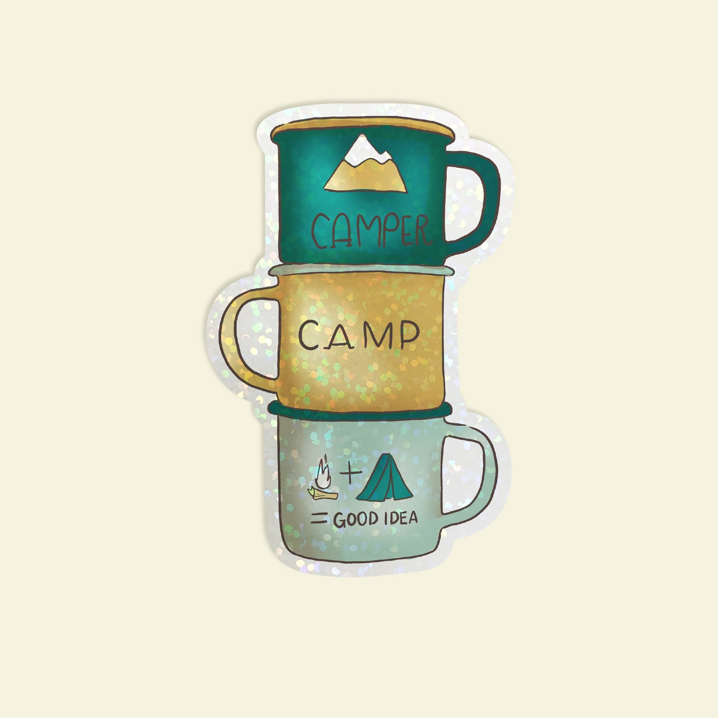 A fun Camping Mugs Die Cut Sticker for the one that loves the outdoors and camping. These stickers are printed on premium matte sticker paper with a glitter holo overlay.
