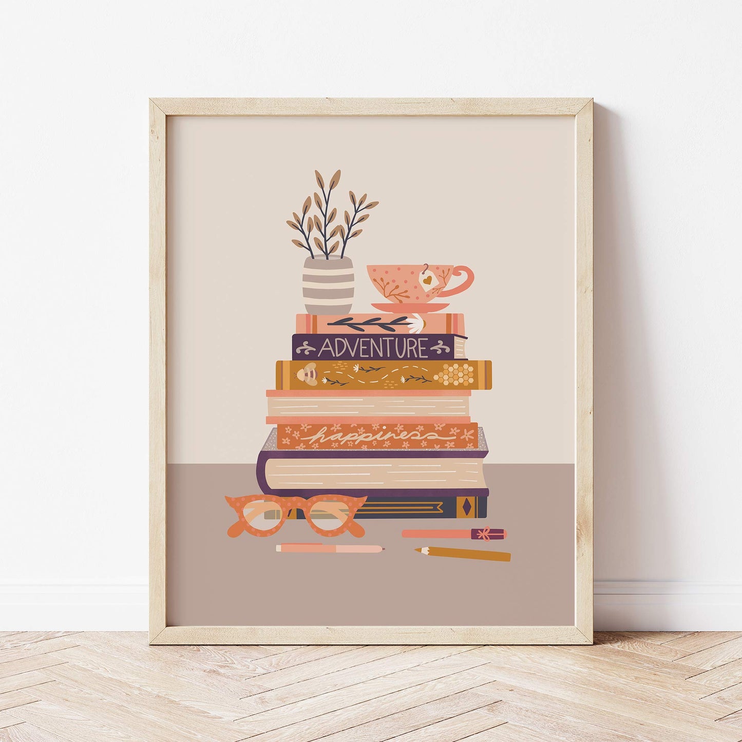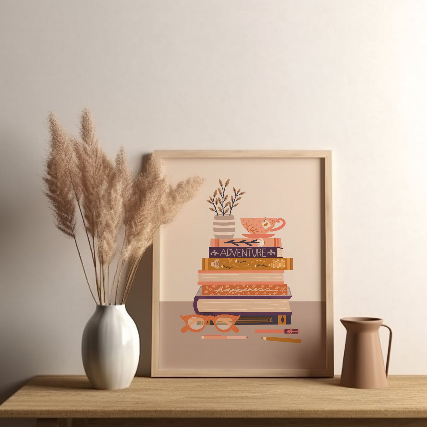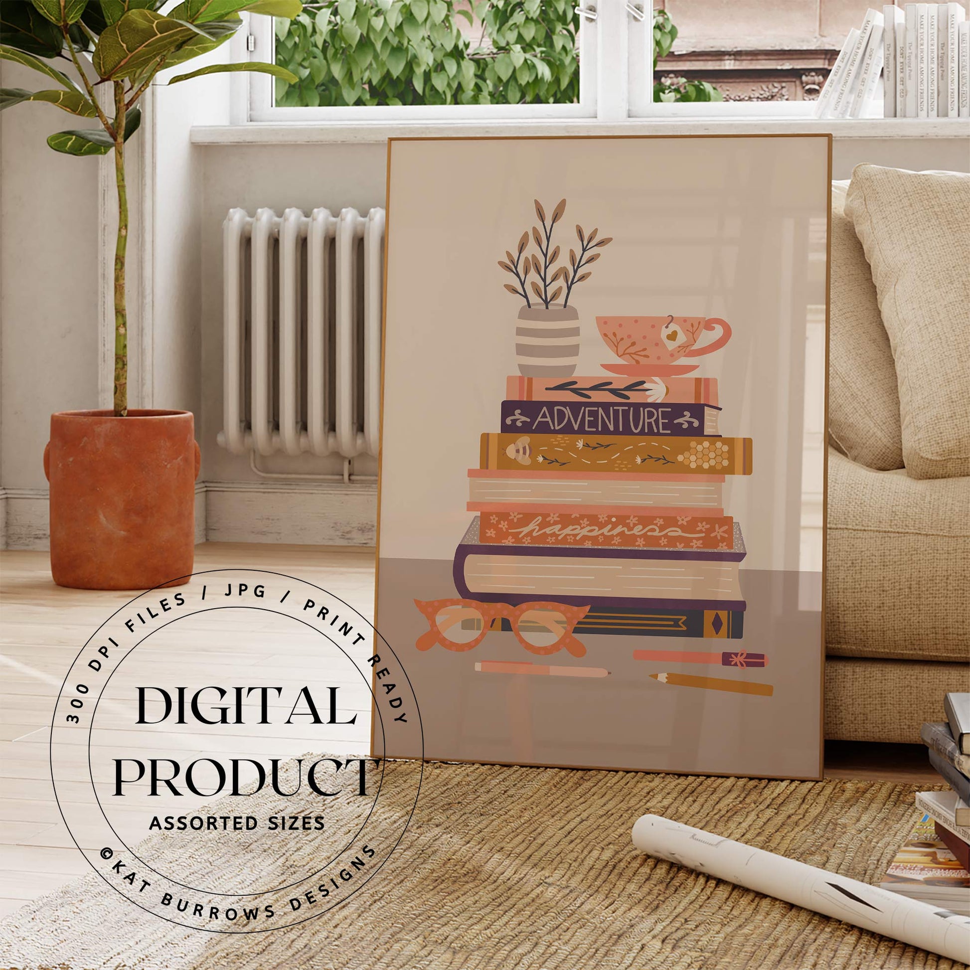 A beautiful illustrated Bookish Sunset Colours Art Print. This digital art print can be printed at home or at a print shop.