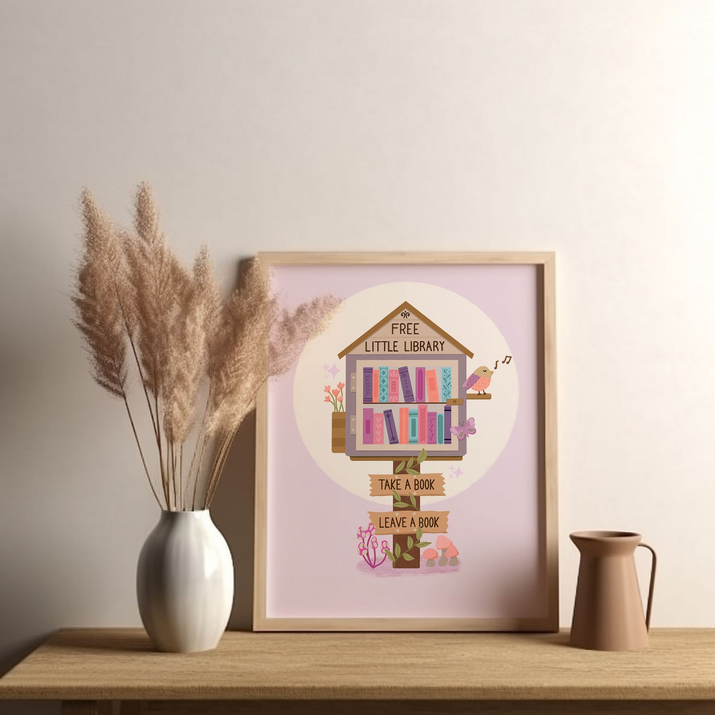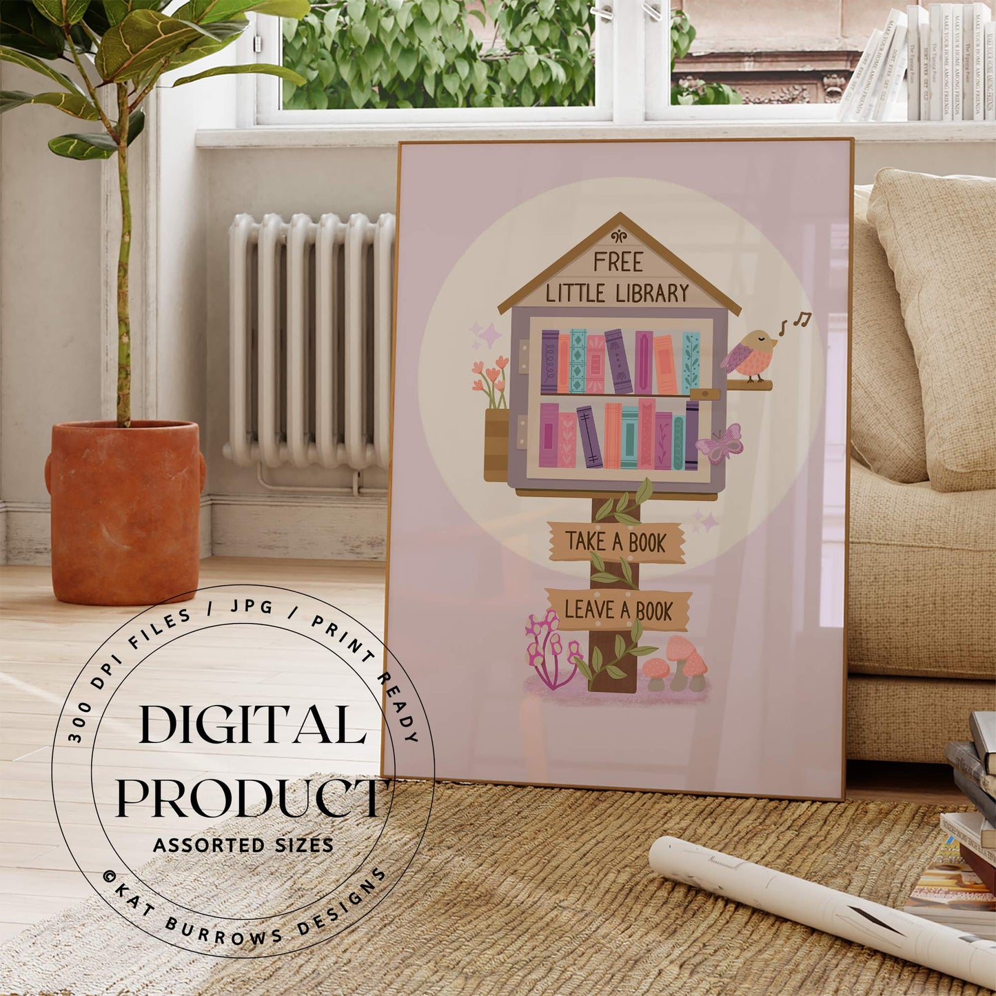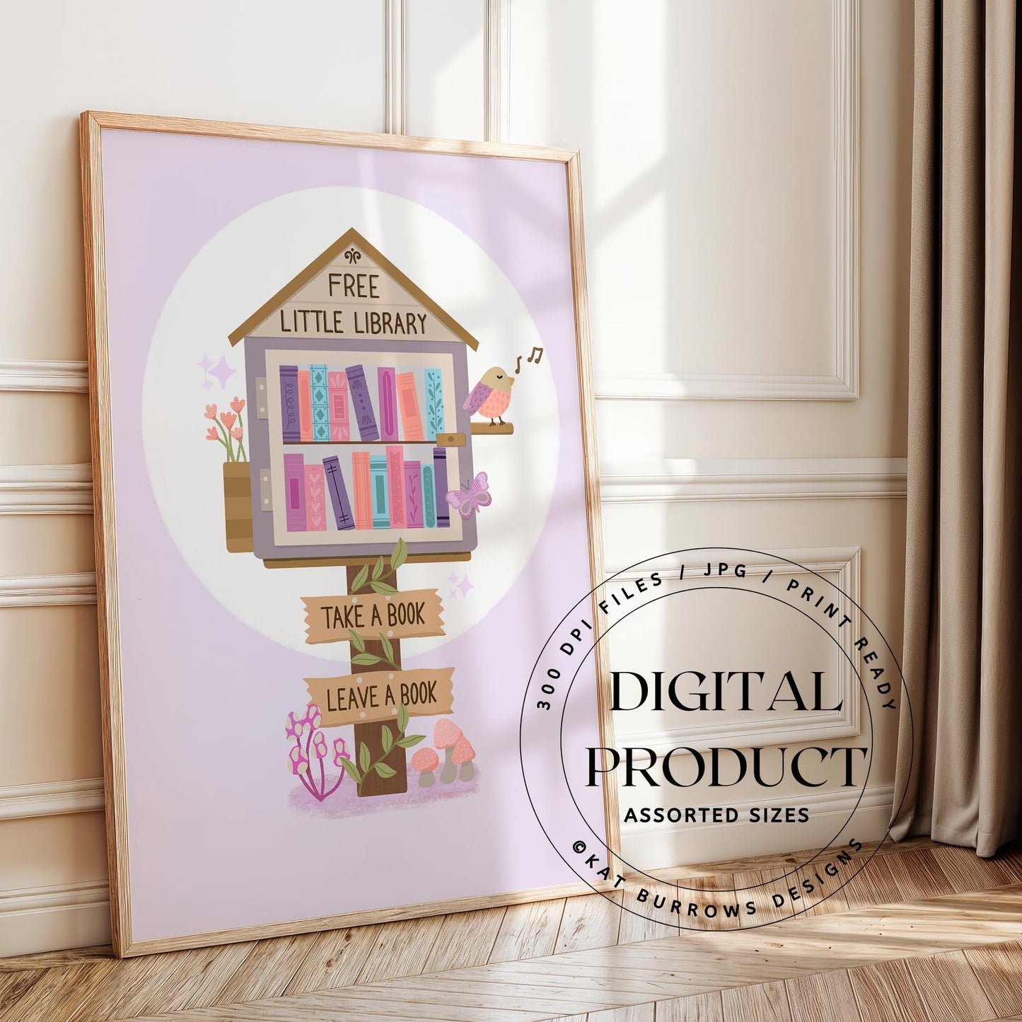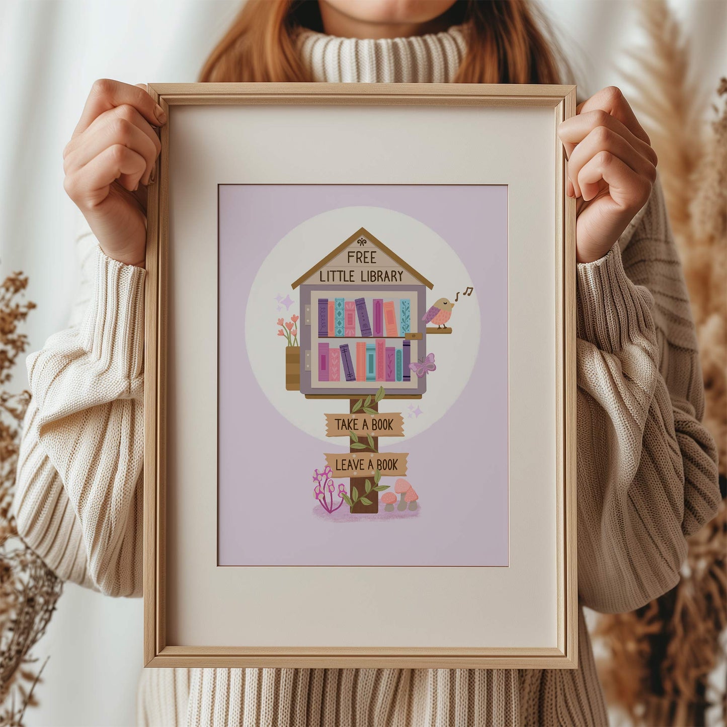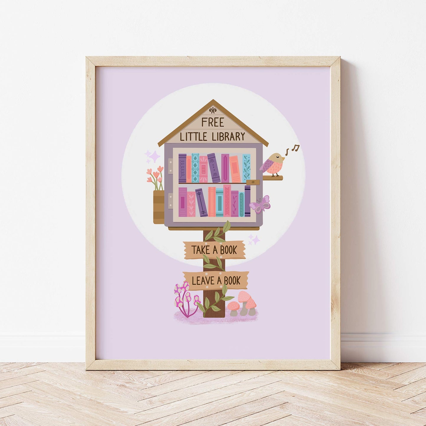 A beautiful illustrated Little Library Purple Bookish Art Print. This digital art print can be printed at home or at a print shop.