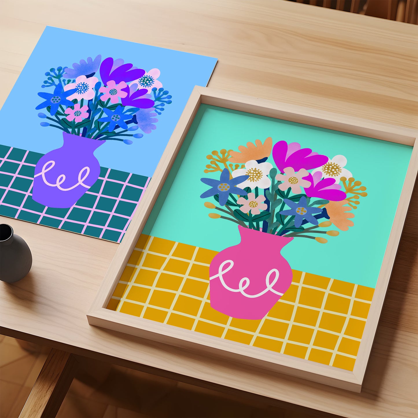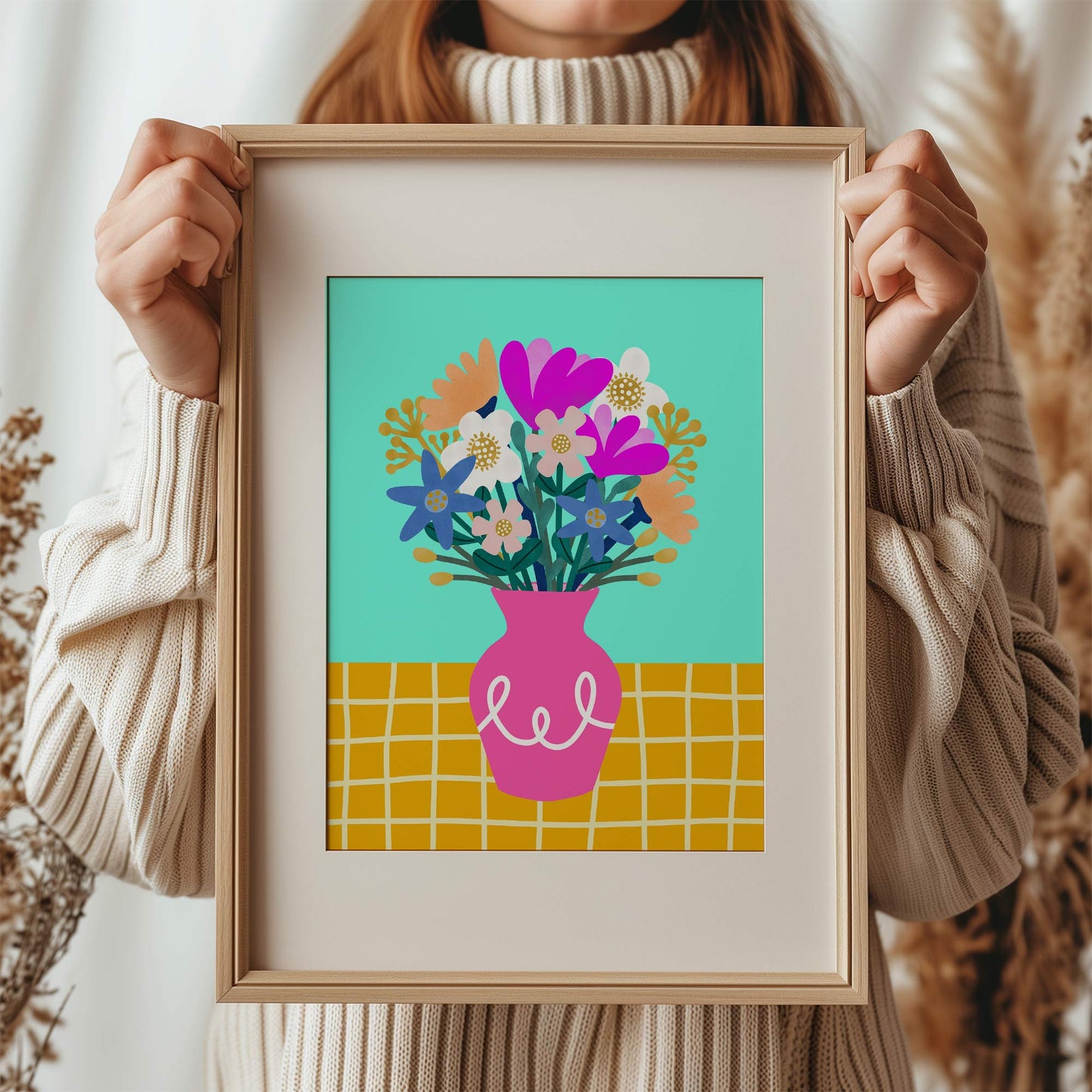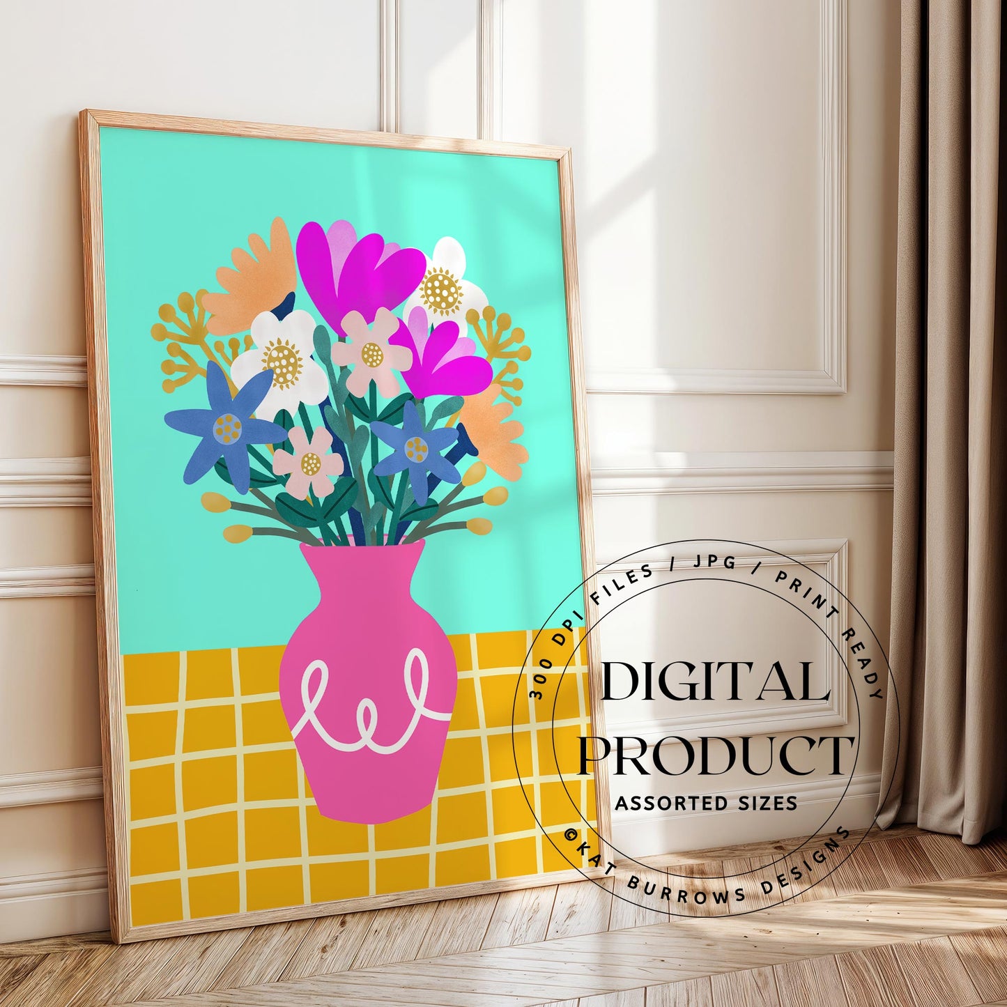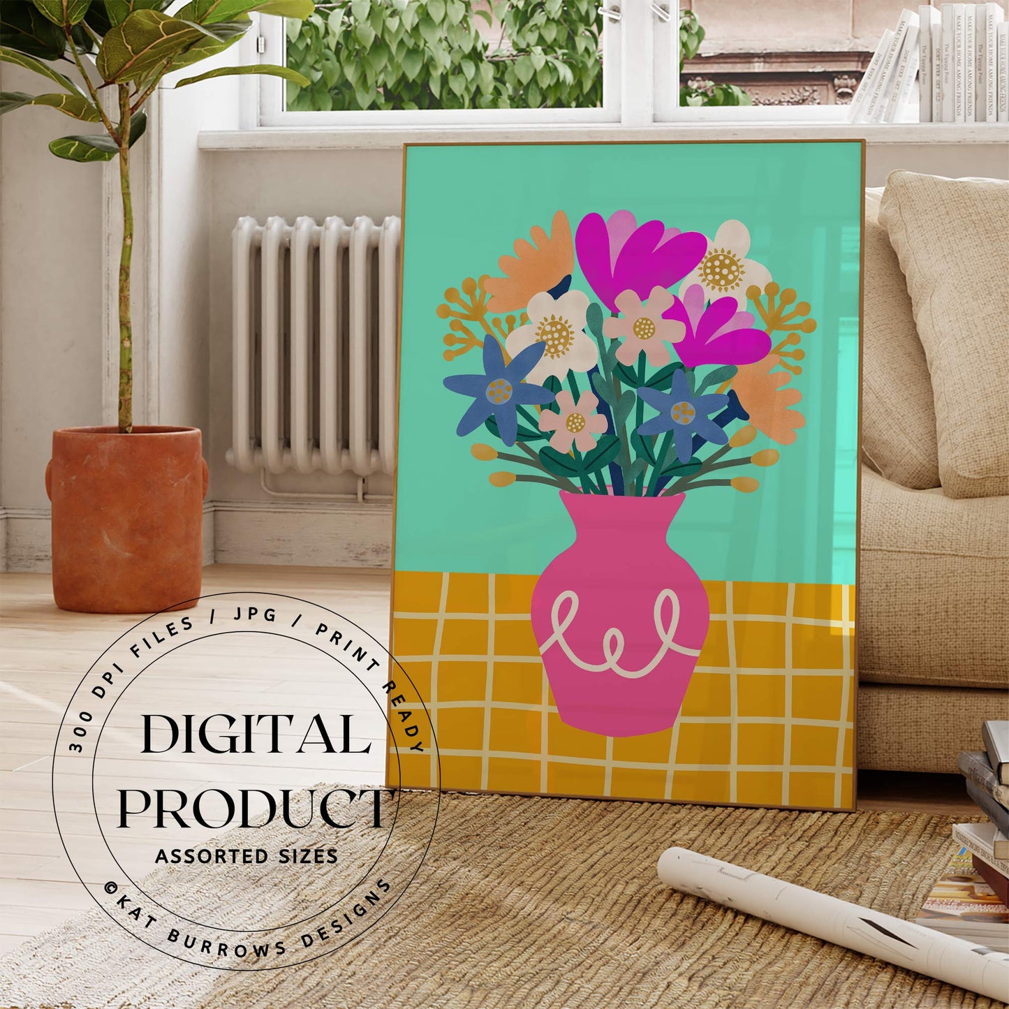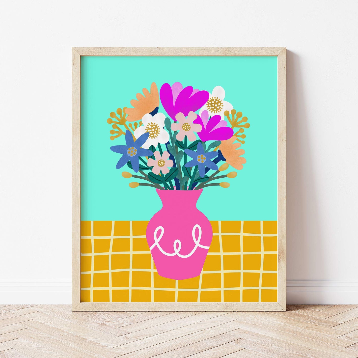 A beautiful illustrated Pink Vase of Flowers Art Print. This digital art print can be printed at home or at a print shop.
