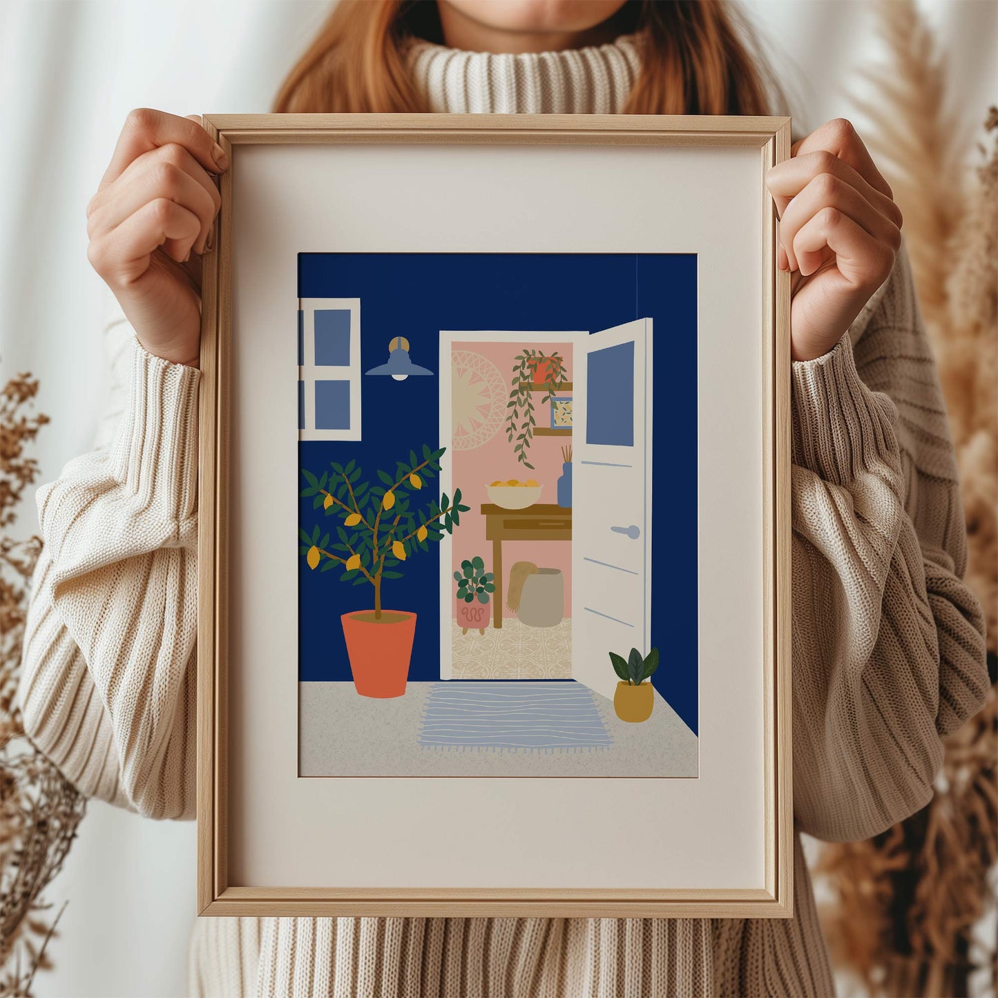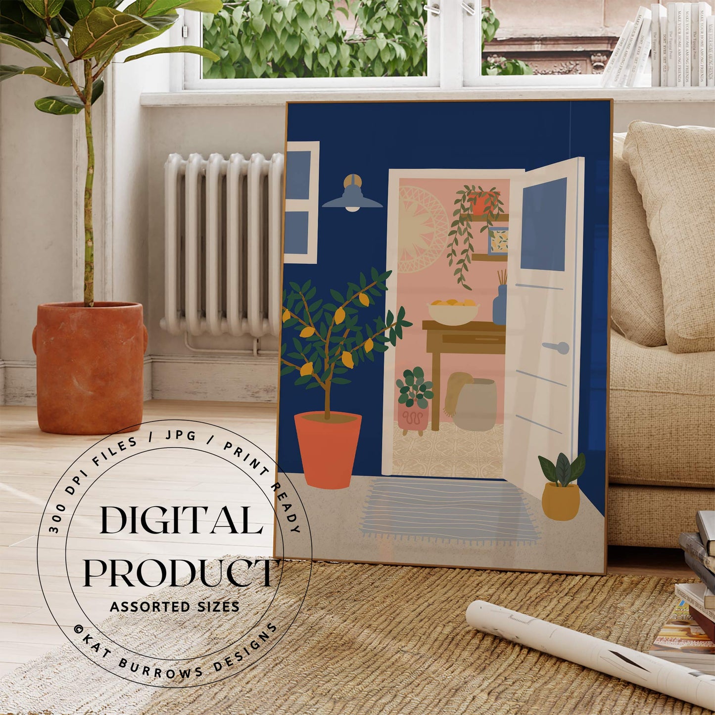 A beautiful illustrated Entry Way in Blue with Indoor Plants and a Lemon Tree Art Print. This digital art print can be printed at home or at a print shop.