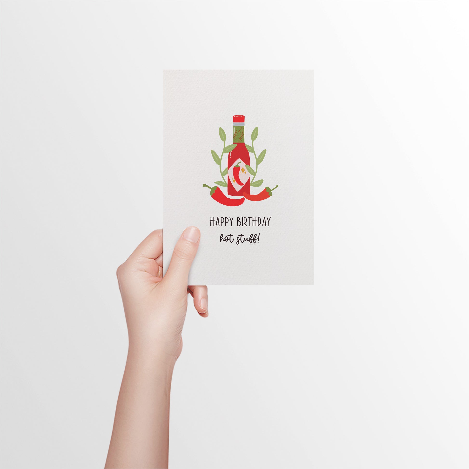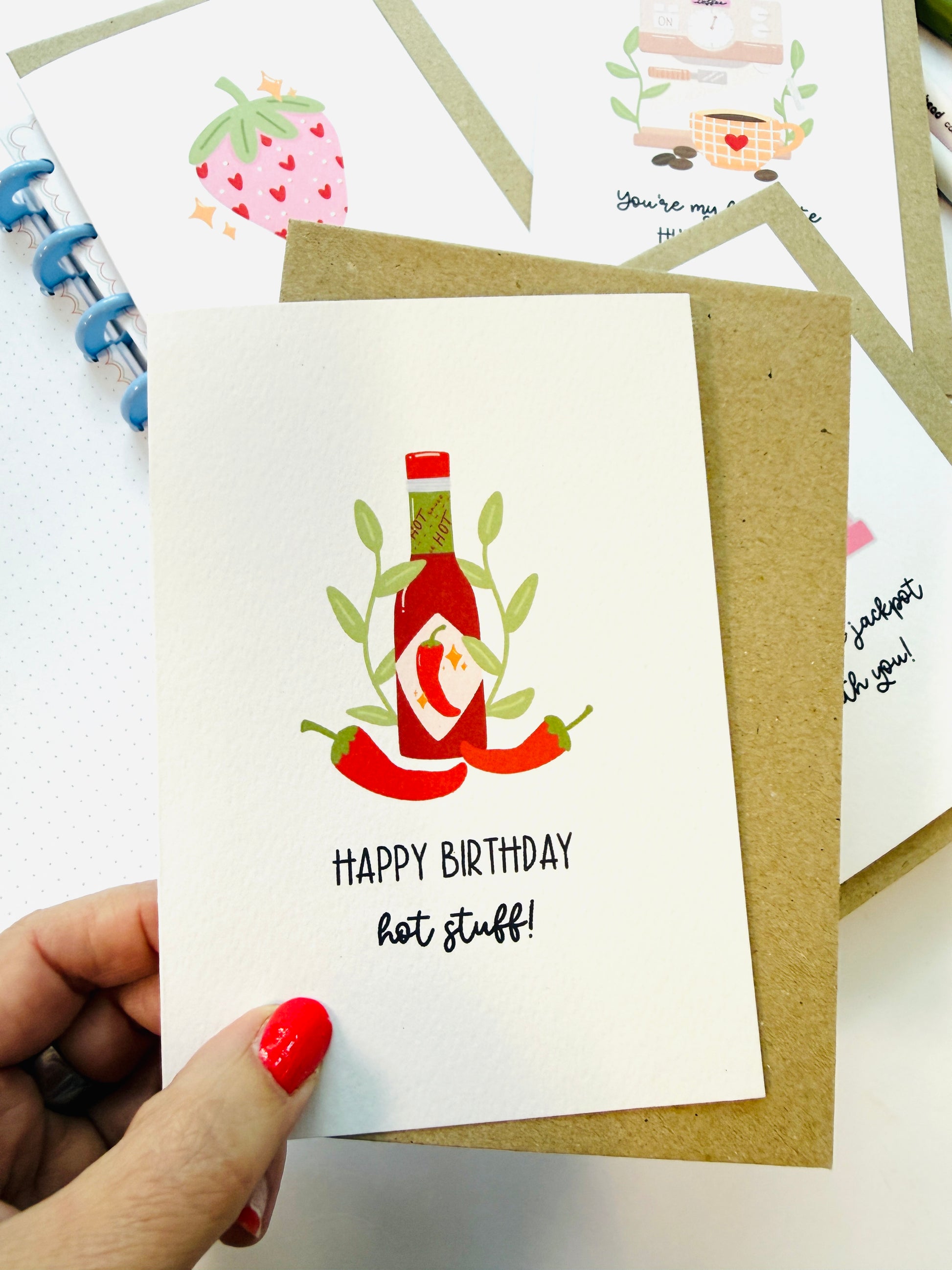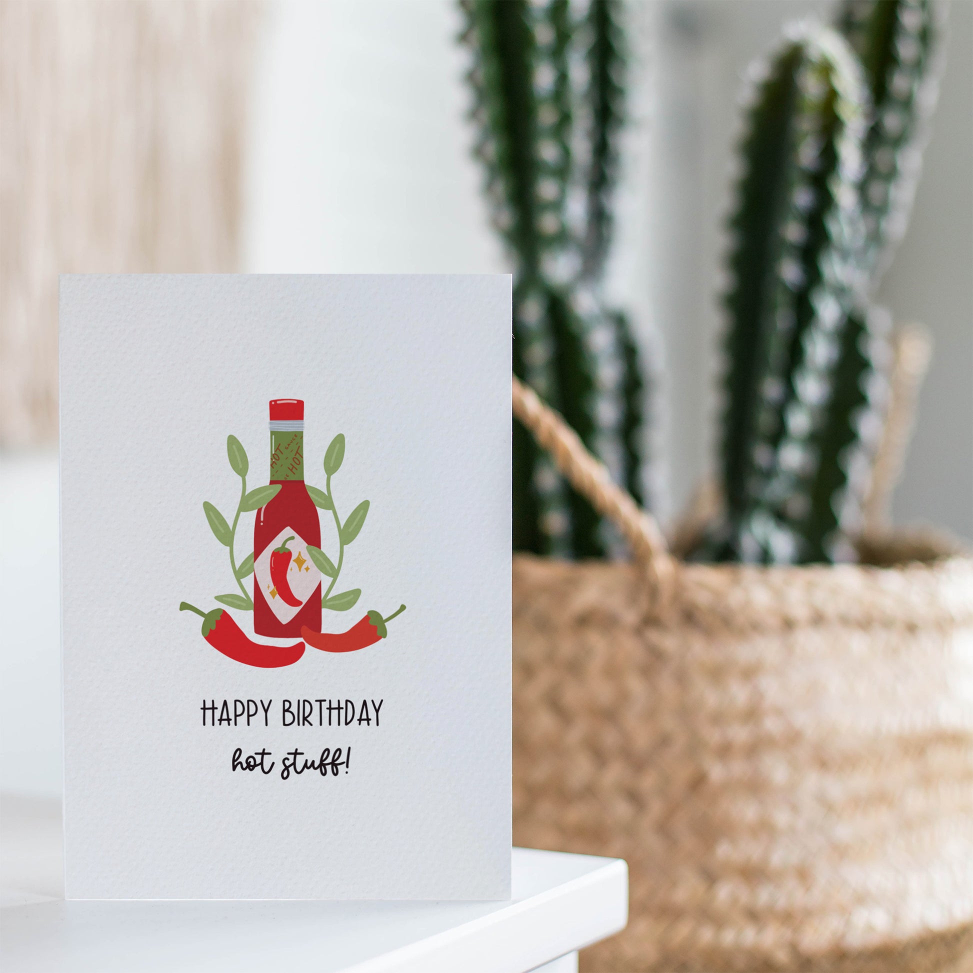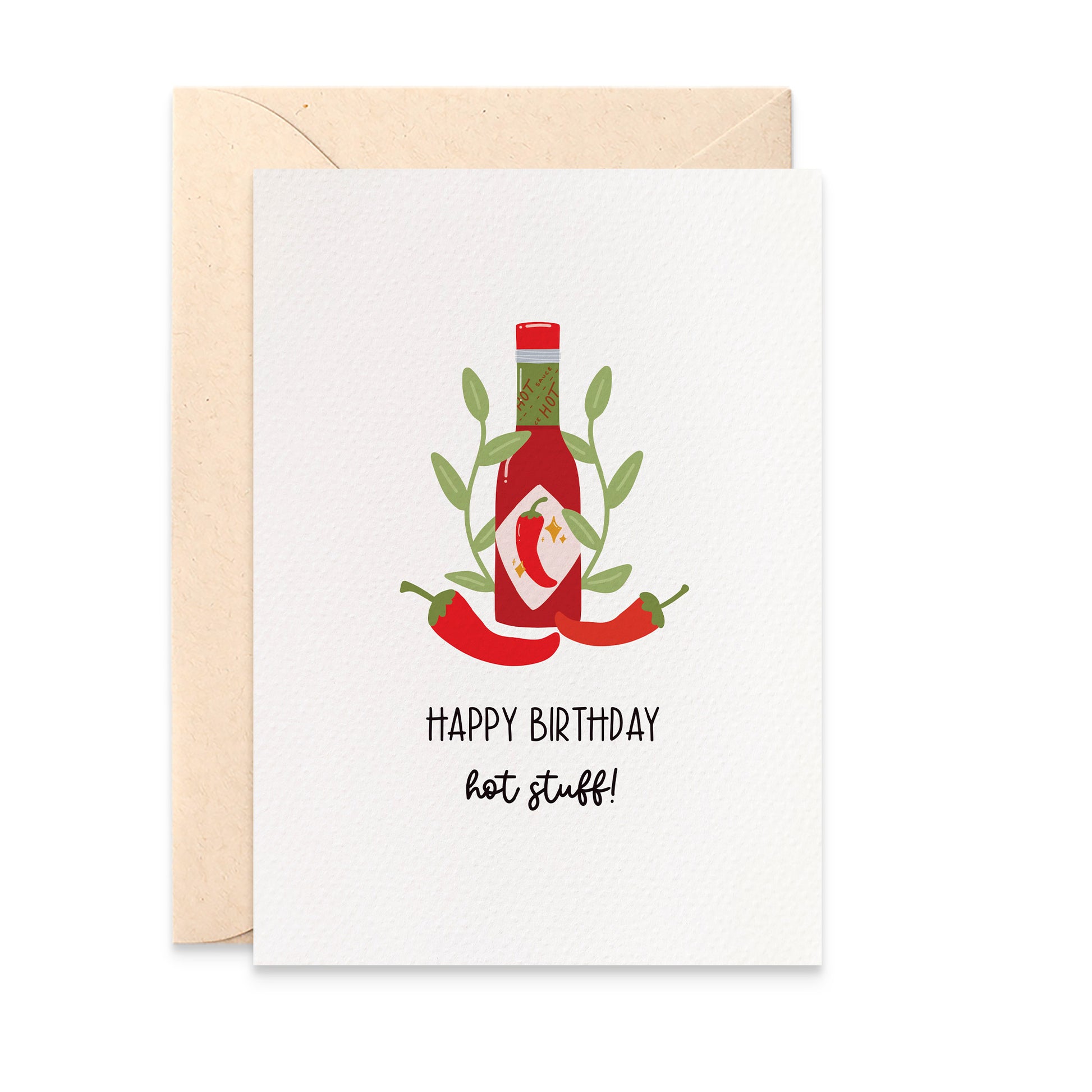 This playful birthday greeting card features the phrase ‘Happy Birthday Hot Stuff’. A fun and bold choice for celebrating birthdays with a little extra spice.
