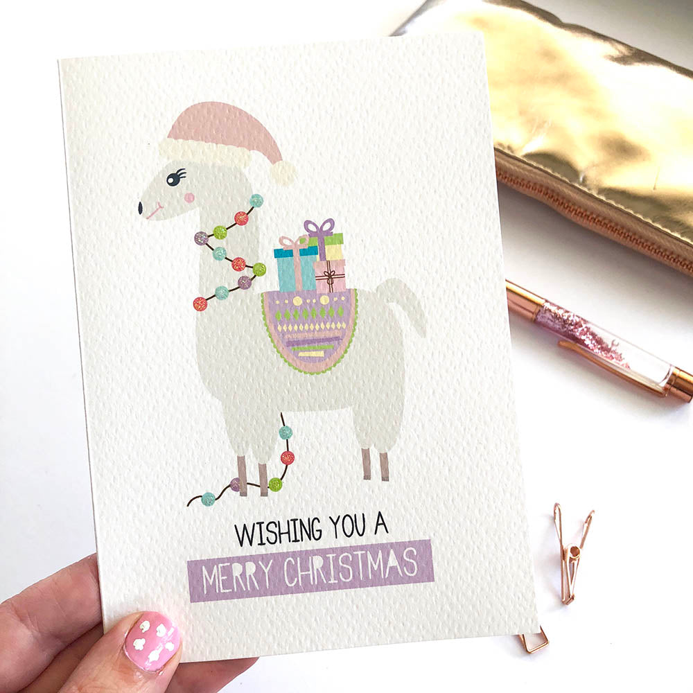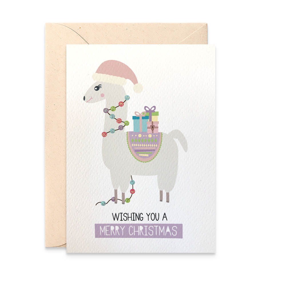 A fun and bright Handmade Christmas Card featuring a Llama with Christmas Lights and the words Wishing you a Merry Christmas. A beautiful card to celebrate this wonderful time of the year.