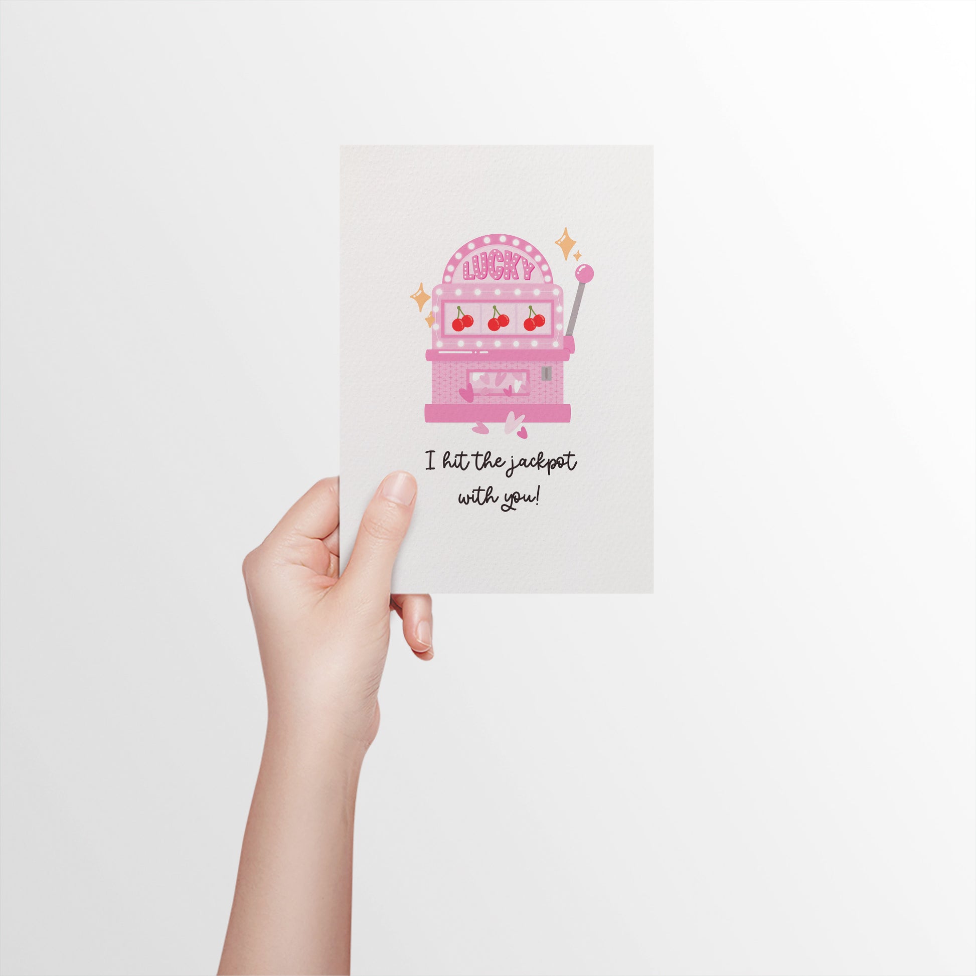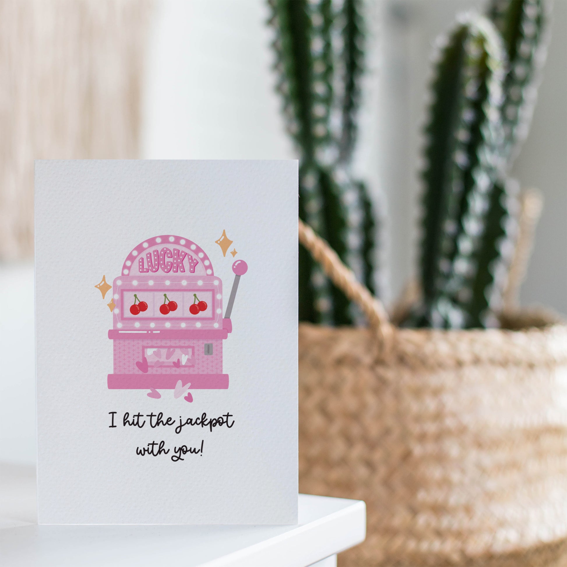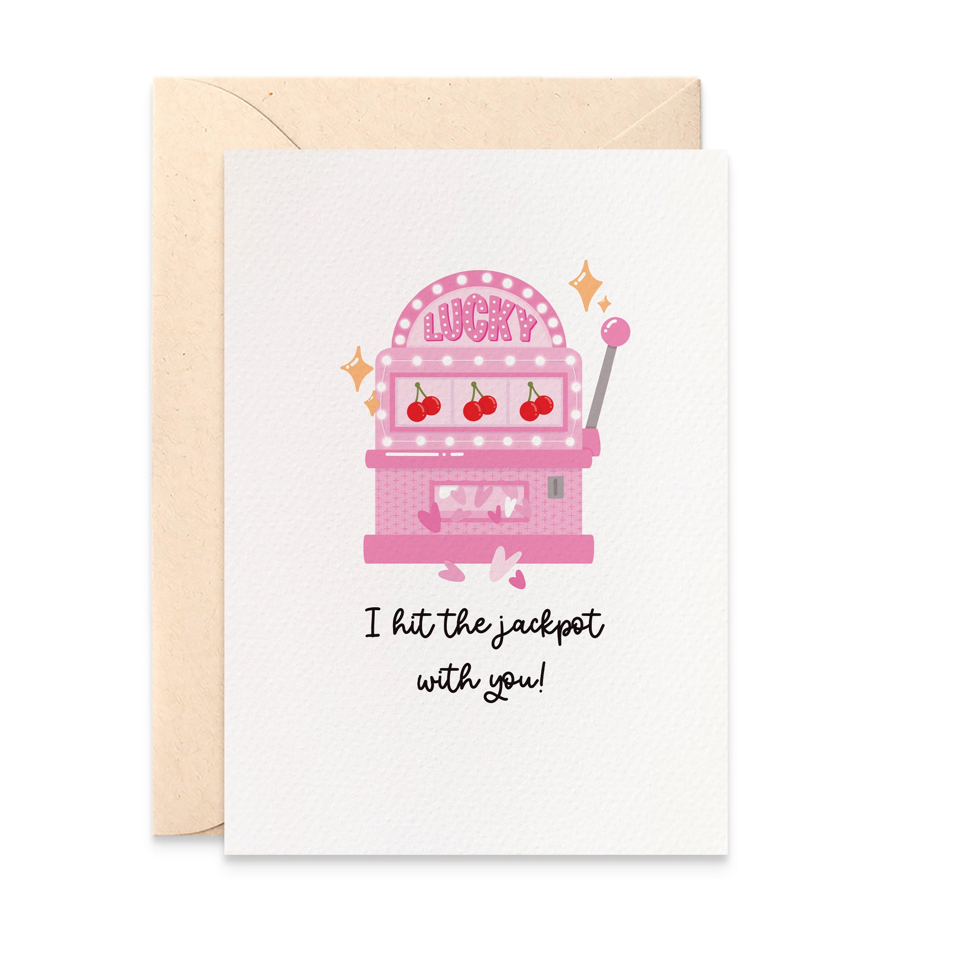 This slot machine greeting card features the phrase ‘I hit the jackpot with you’. A fun and playful way to celebrate love for Valentine’s Day, anniversaries, or just because.