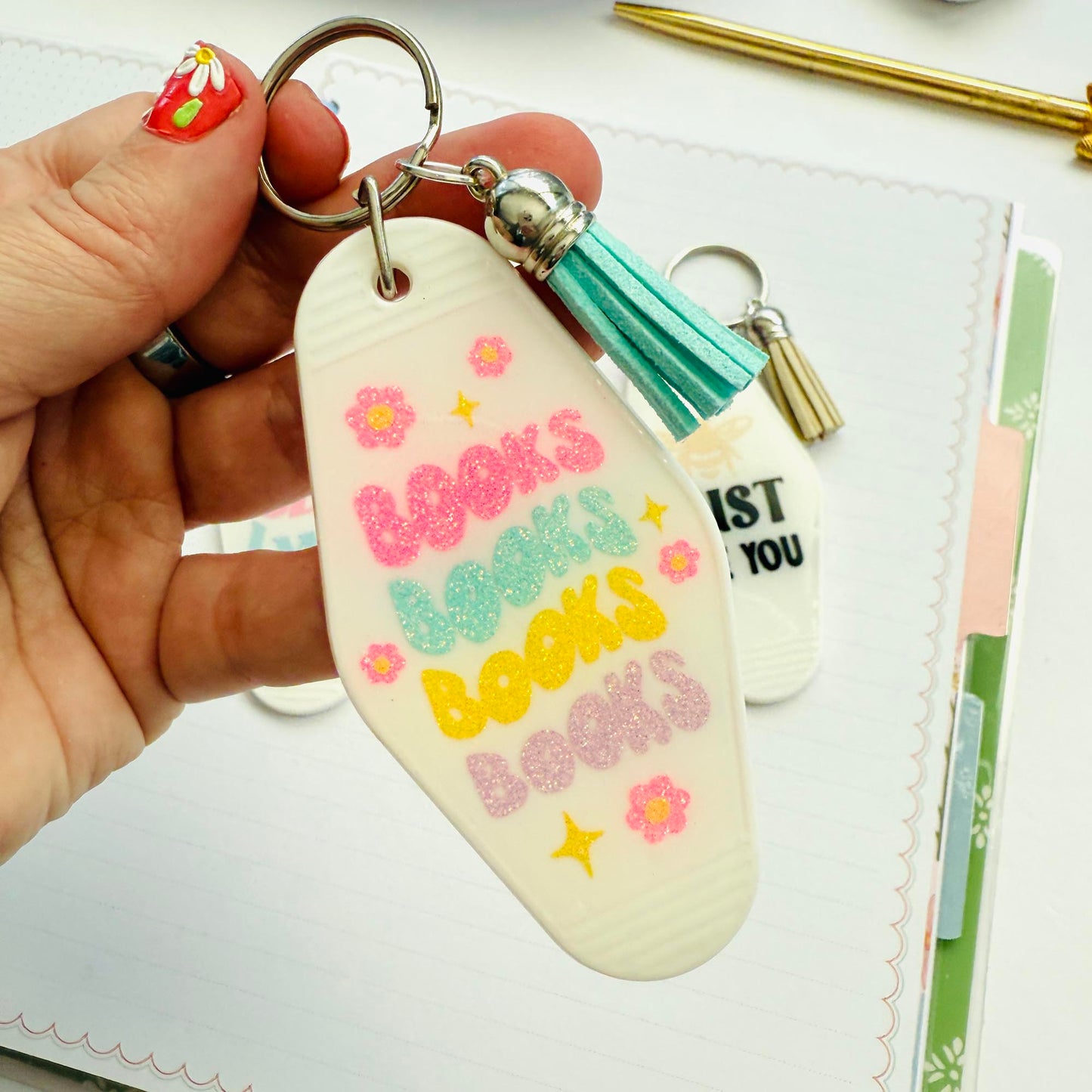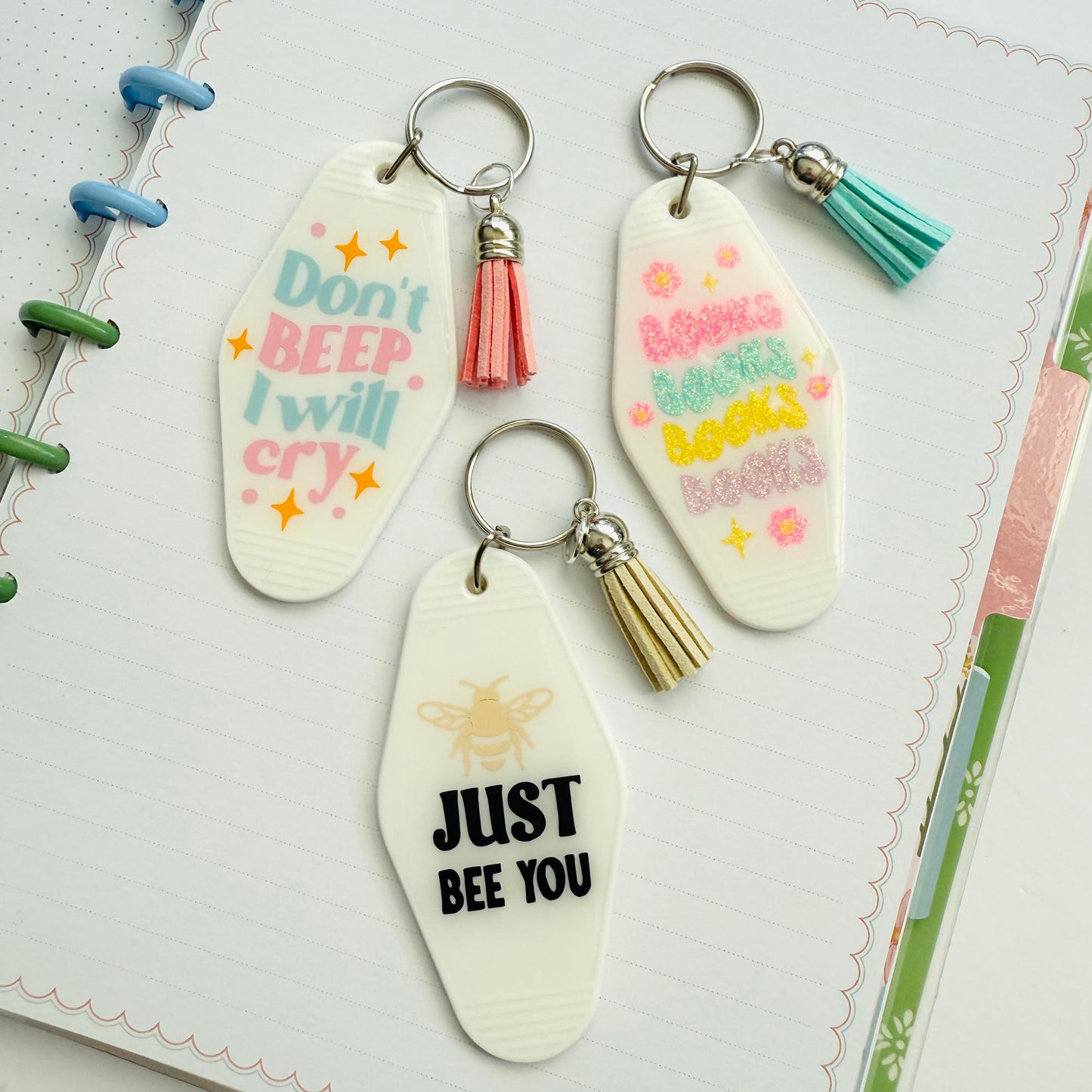 A beautiful motel epoxy coating keychain perfect for your keys or to decorate your bags.