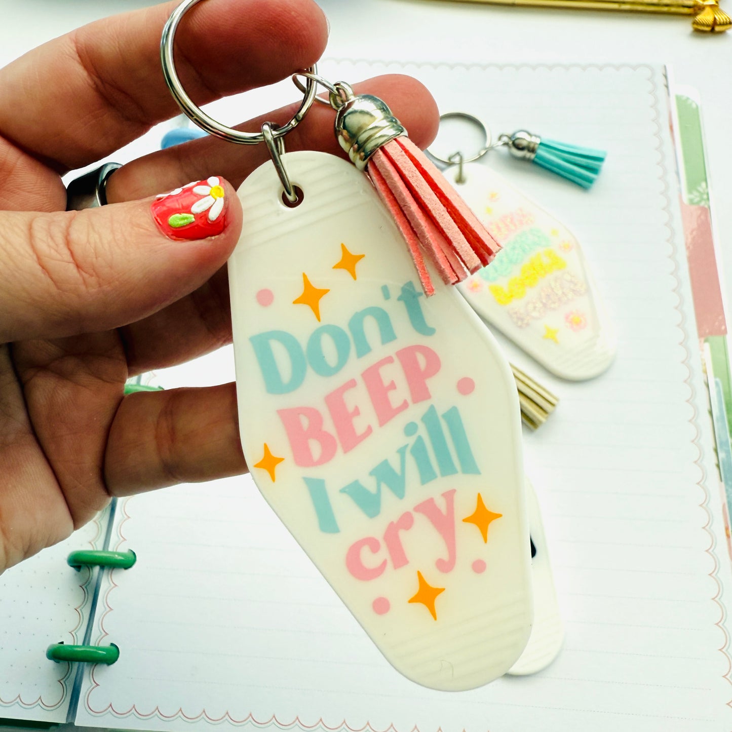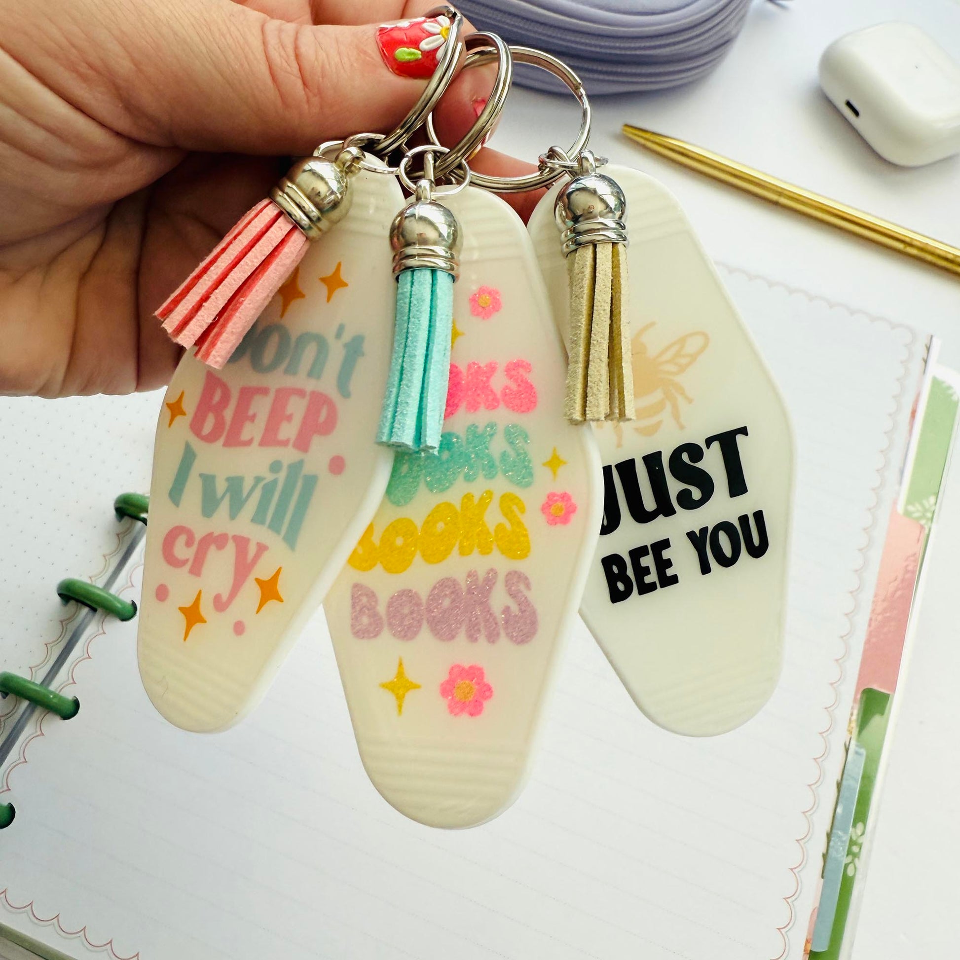 A beautiful motel epoxy coating keychain perfect for your keys or to decorate your bags.