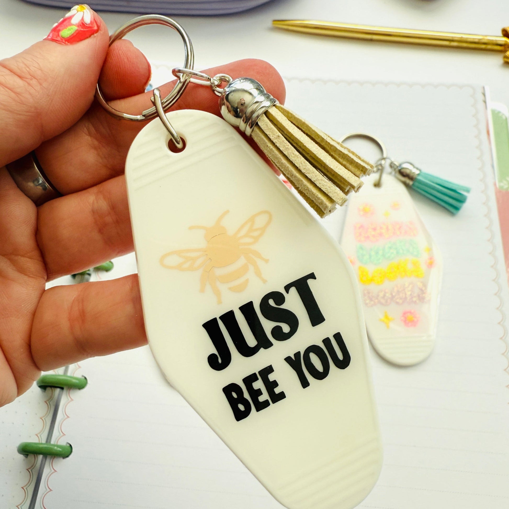 A beautiful motel epoxy coating keychain perfect for your keys or to decorate your bags.