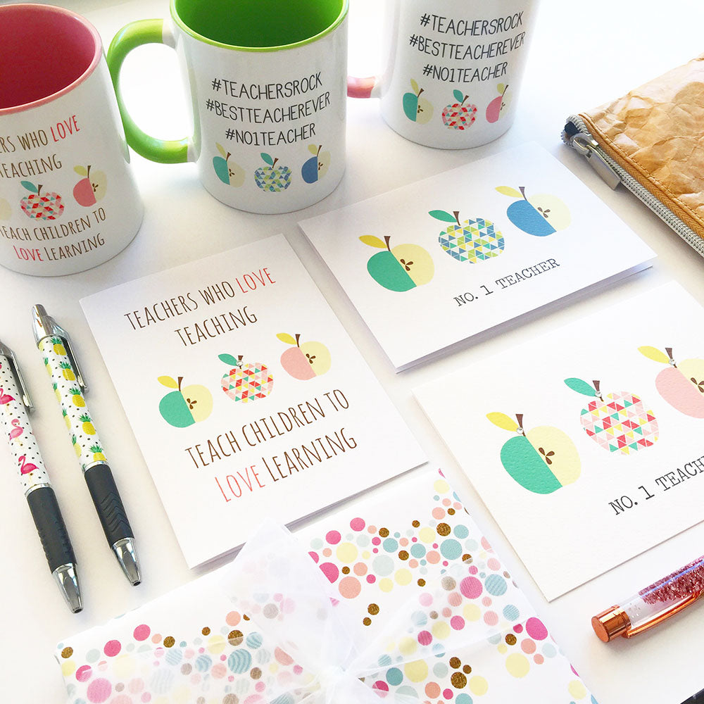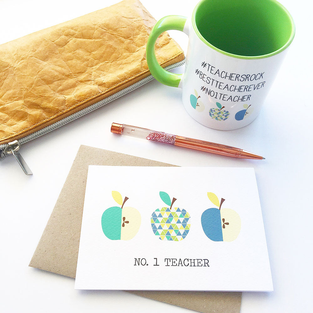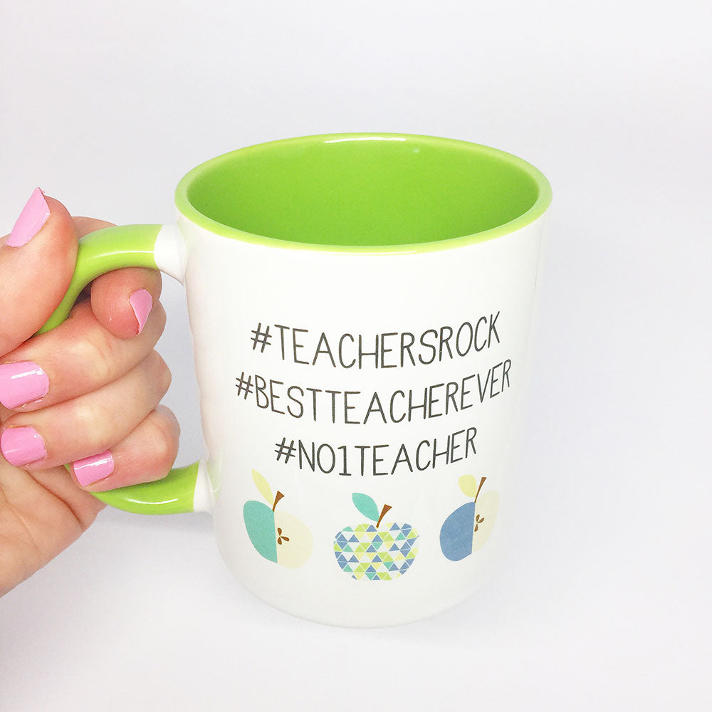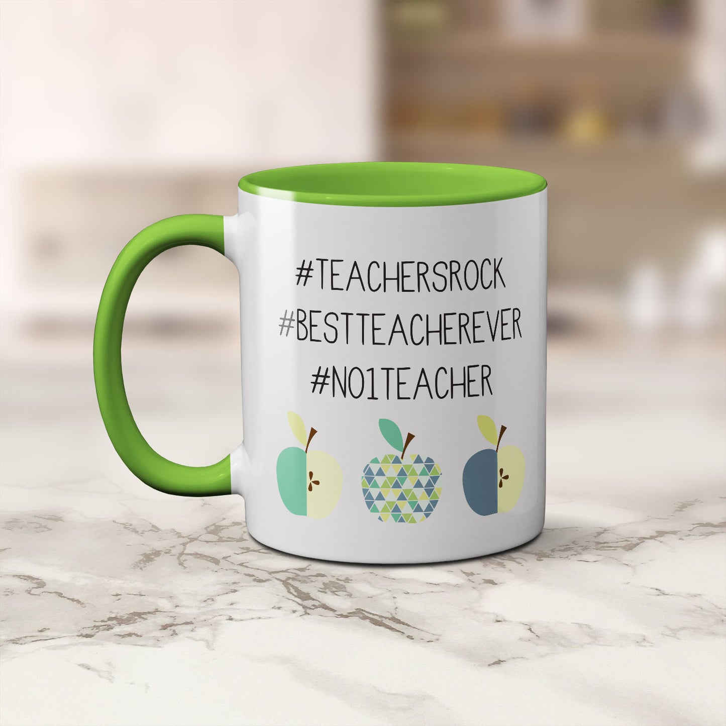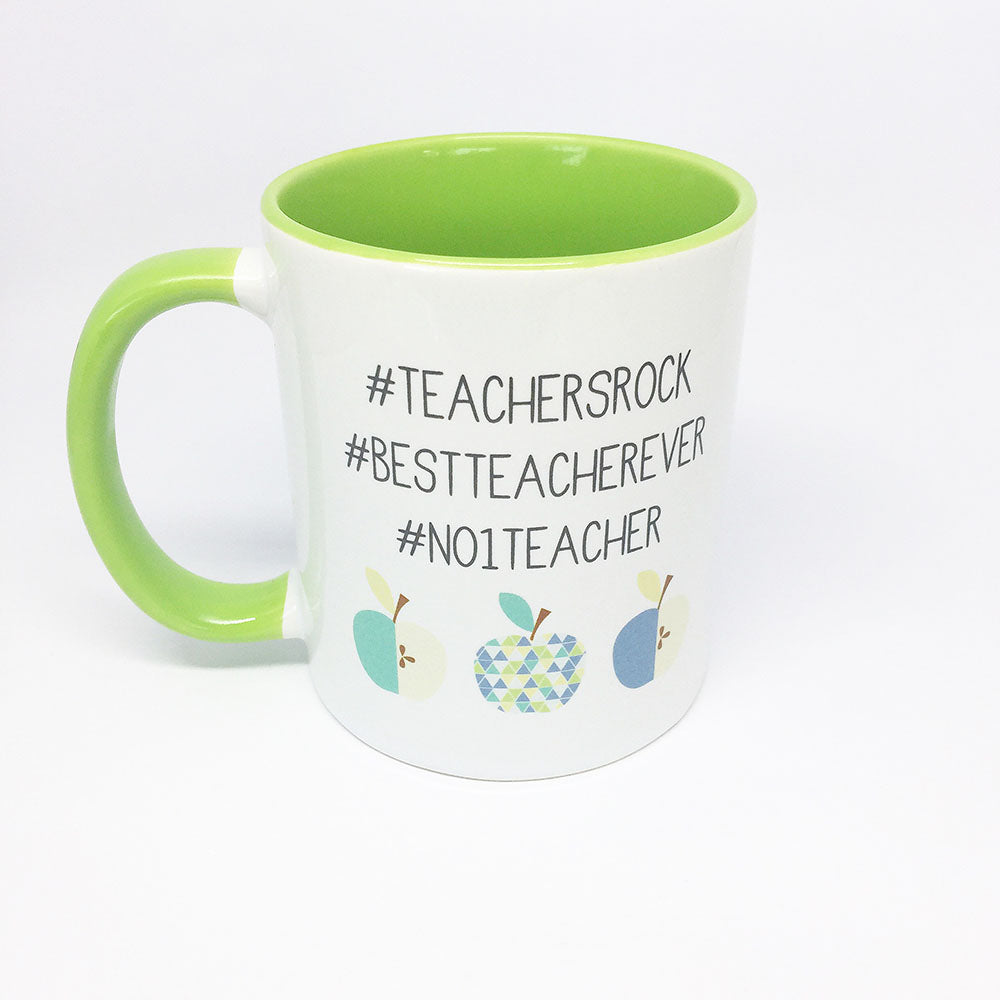 A bright coffee mug for that very special teacher with 3 Awesome Teacher Hashtags with 3 Geometric Blue and Green Apples. This is a 11oz white coffee cup with a gorgeous green handle and it is also green along the rim and inside. A fun mug for teachers.