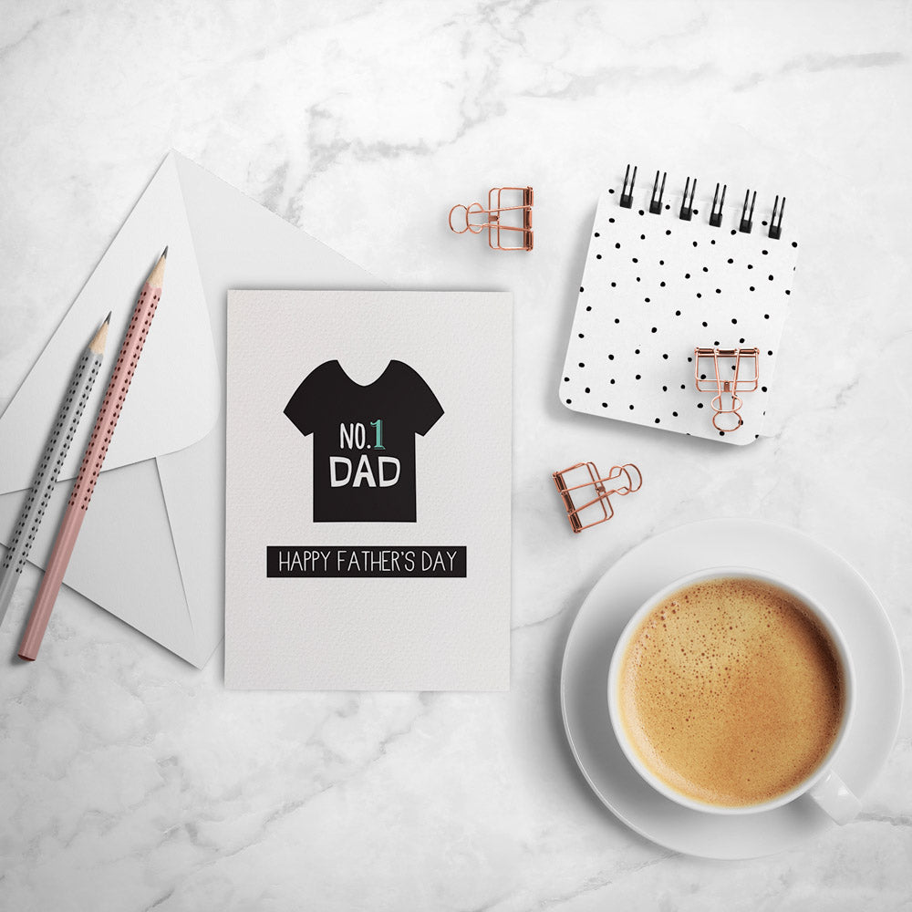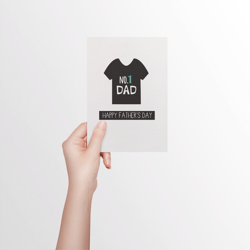 A bright and fun handmade Happy Father's Day Greeting Card featuring a black t-shirt with the words No. 1 Dad with the text saying Happy Father's Day.