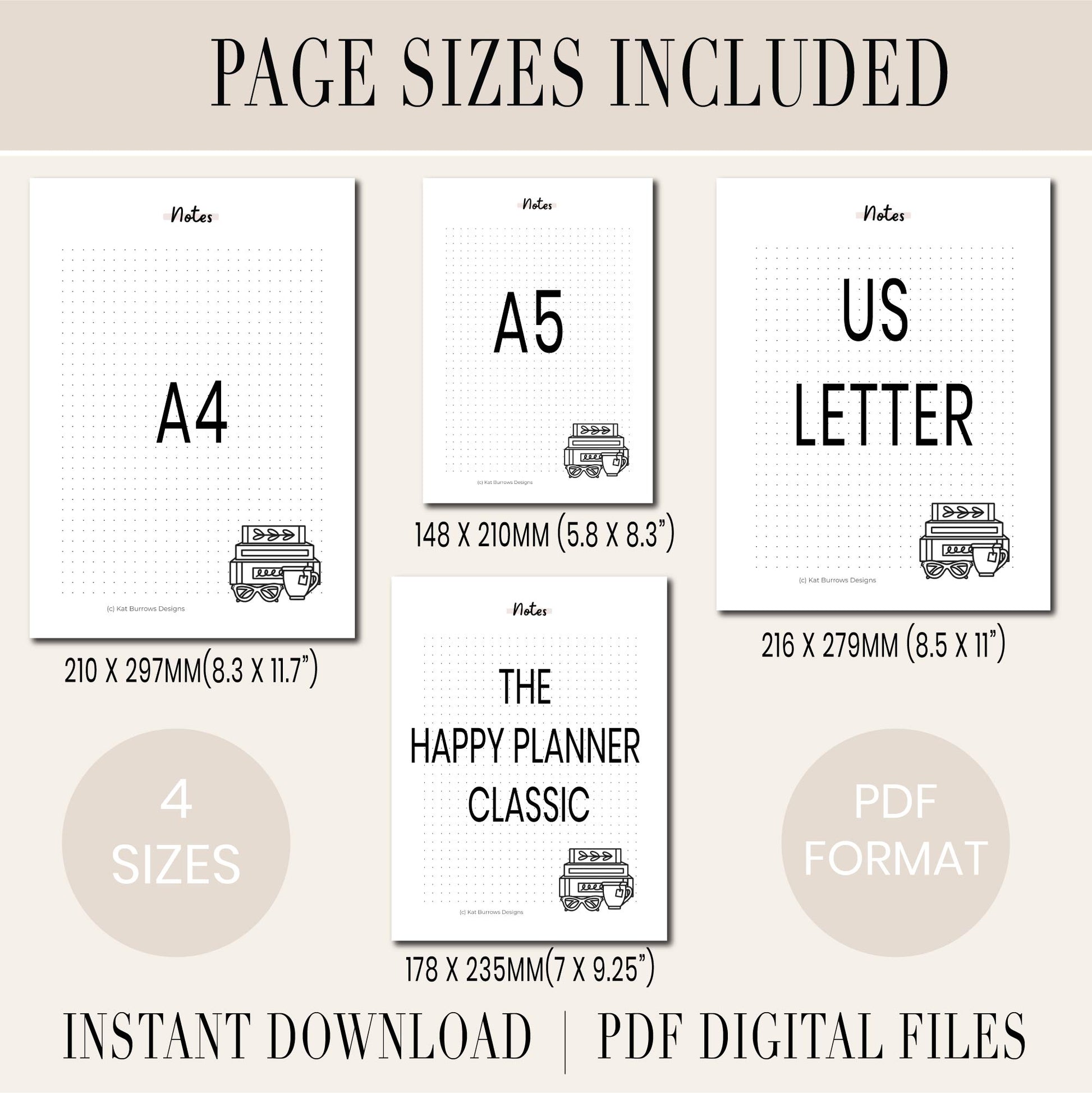 5 separate PDF files (one per size and 2 options for The Happy Planner)
