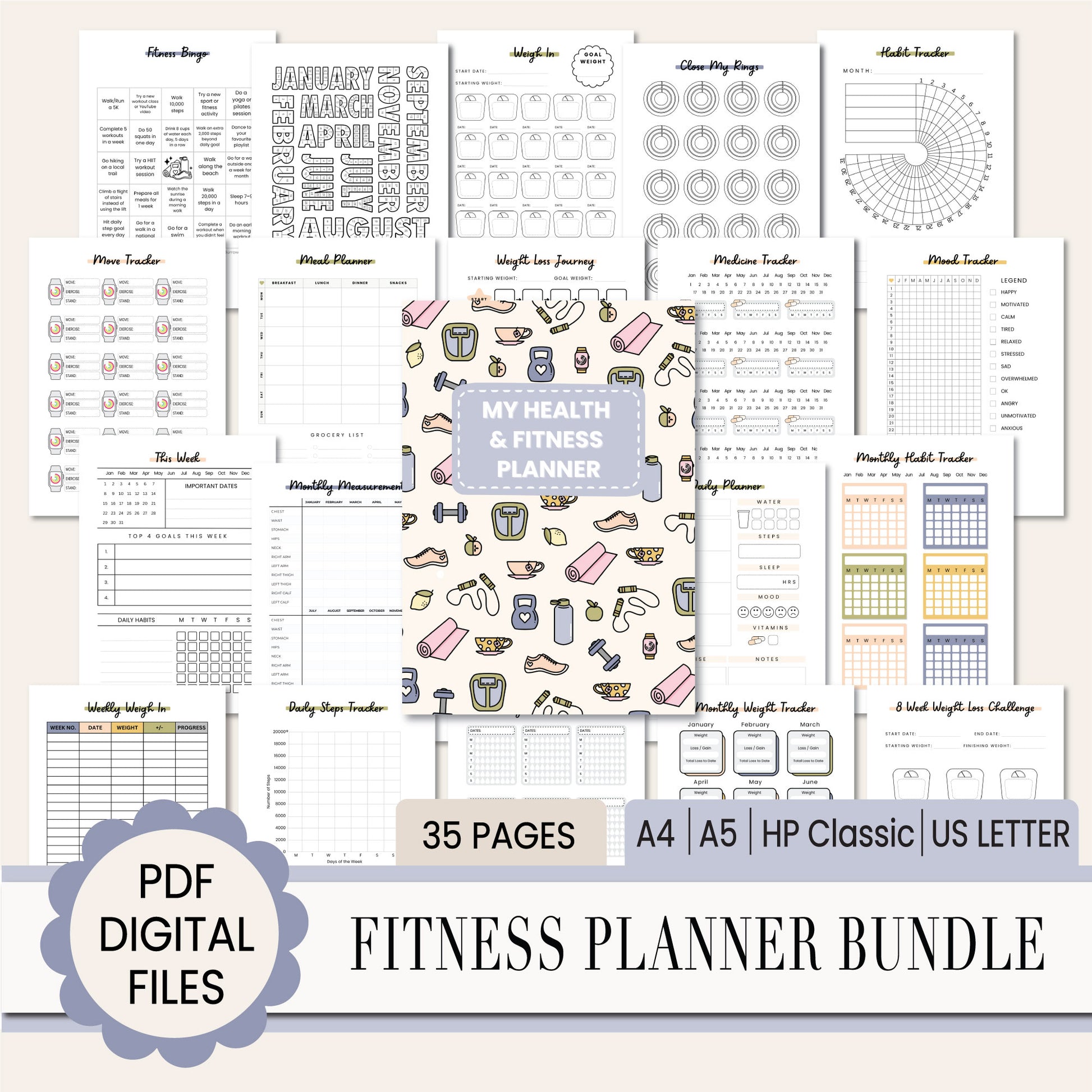 Looking for a way to track your fitness and health goals? This 35-page printable planner bundle includes 31 health and fitness printables plus 4 cover pages, designed to help you track your fitness, build healthy habits, and celebrate your progress.