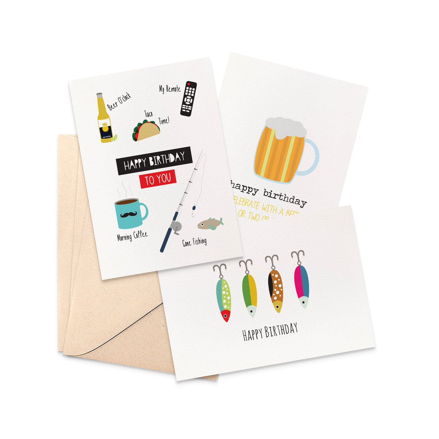 This handmade card pack contains three Handmade Cards featuring Birthday Cards for Men. These are printed folded A6 greeting cards.
