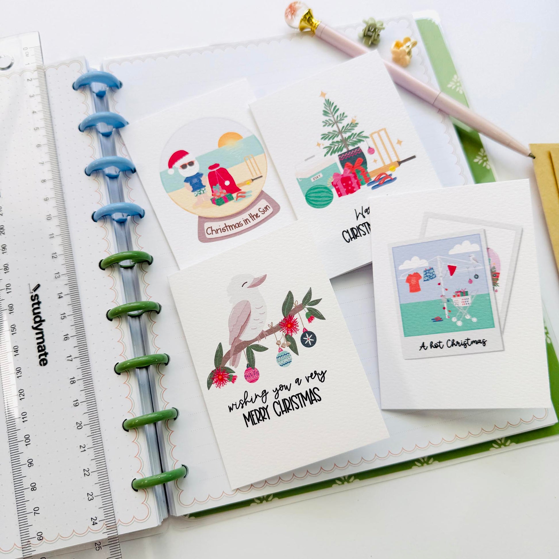 This fun Aussie pack contains 4 Assorted Mini Gift Australian Themed Christmas Cards with Brown Kraft Envelopes featuring a Summer Christmas Theme. These are great to attach to presents for family, friends, neighbours etc.