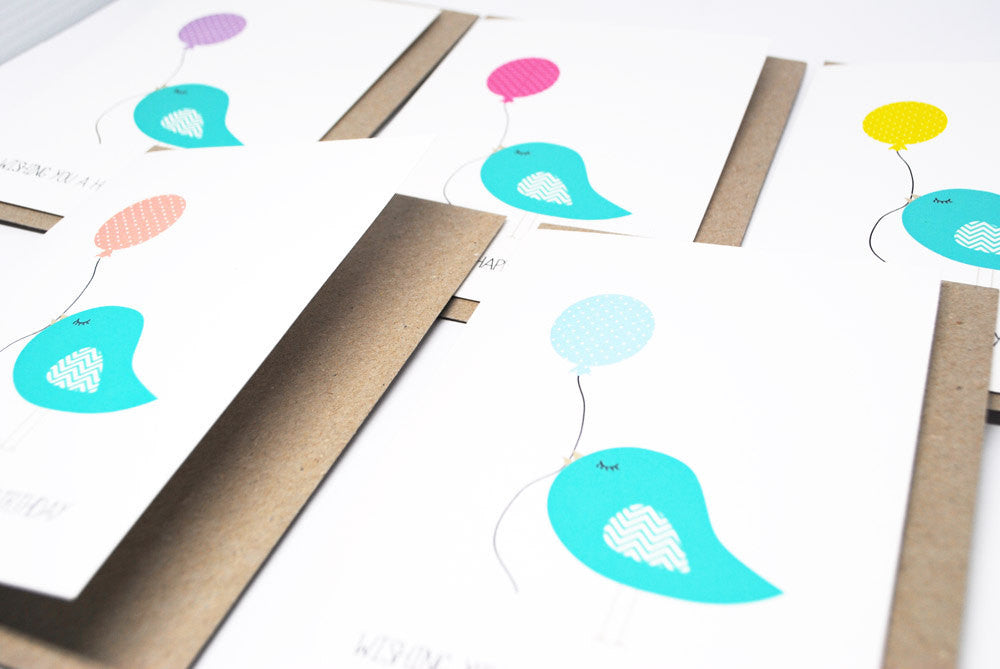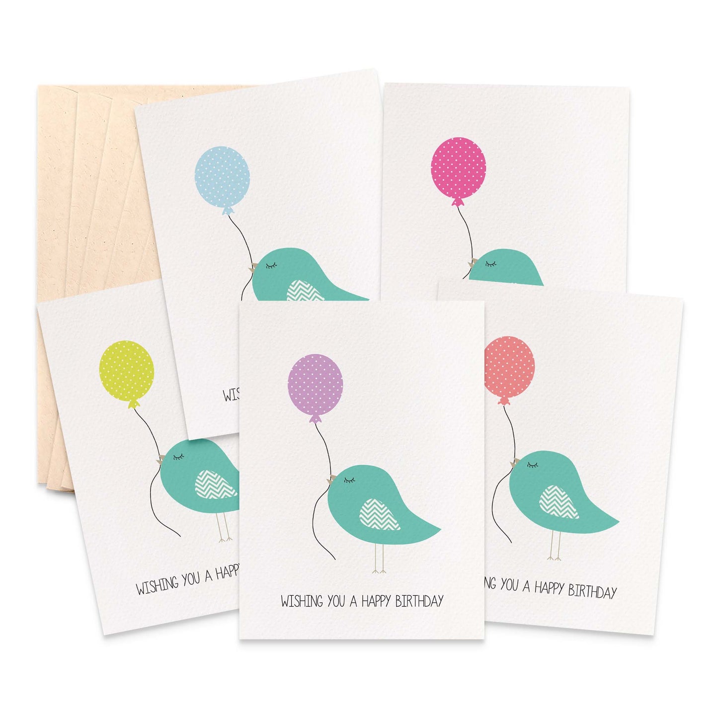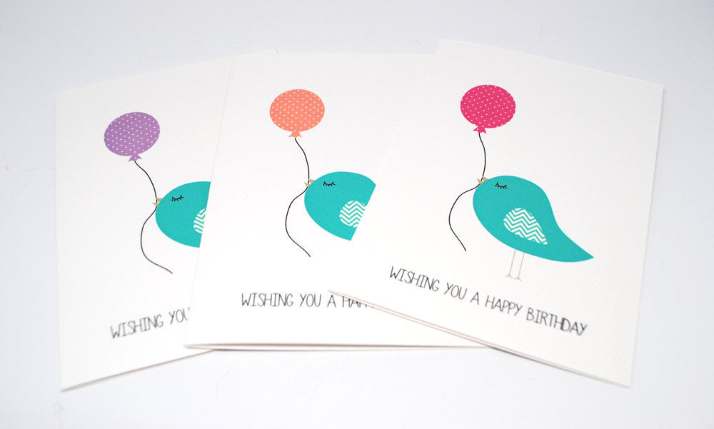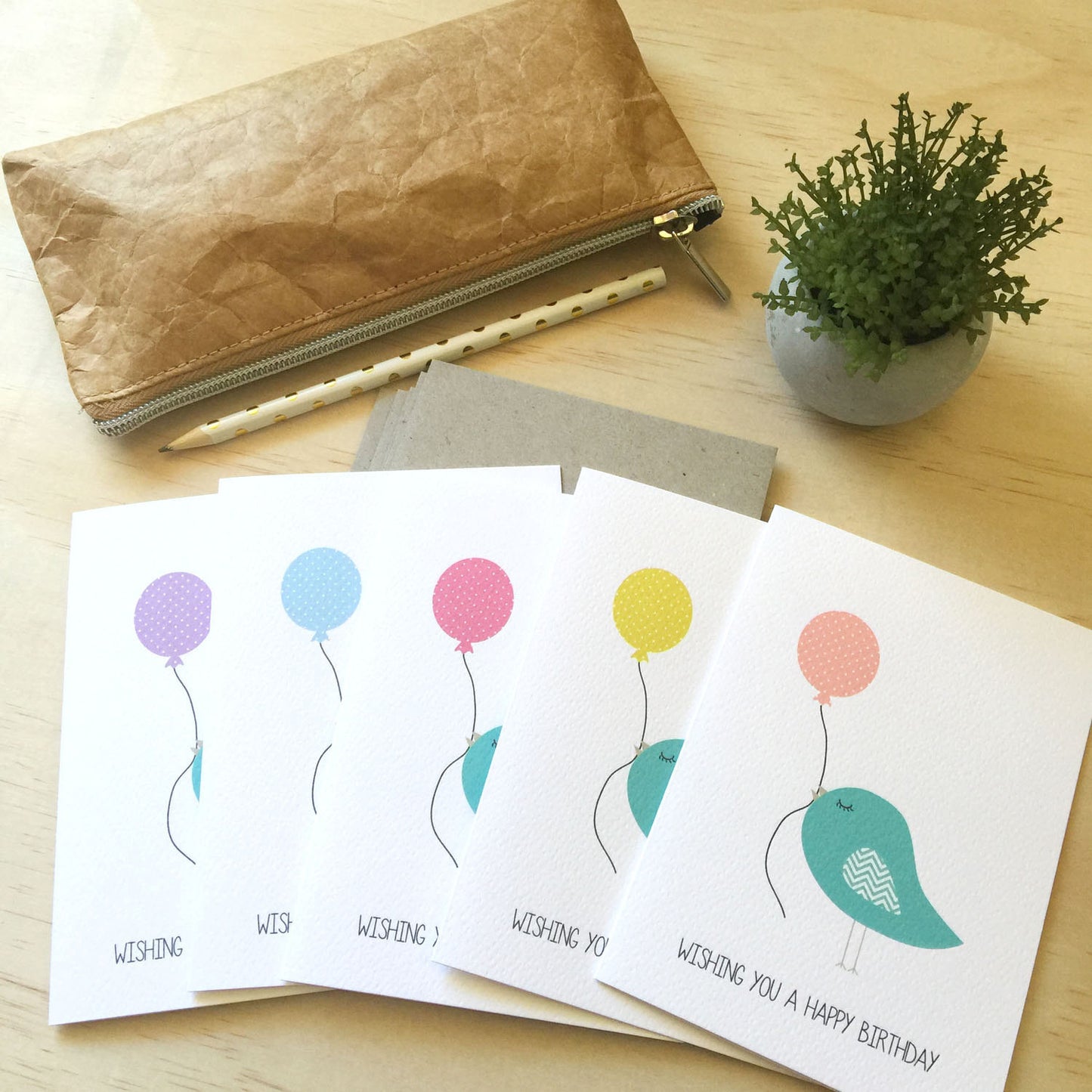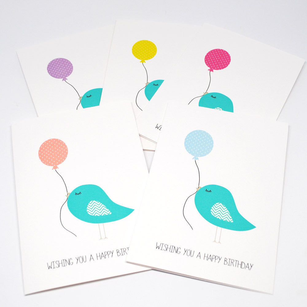 This fun pack contains 5 Handmade Birthday Cards with the words Wishing you a Happy Birthday and includes Turquoise Birdies with Balloons of different colours.