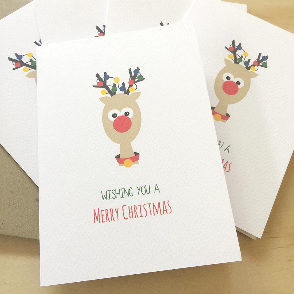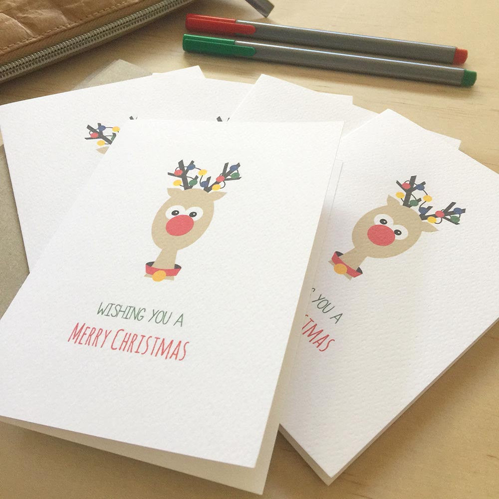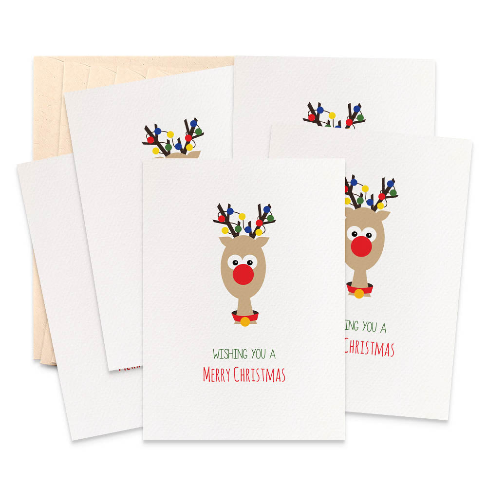 This fun pack contains 5 Handmade Christmas Greeting Cards - Wishing you a Merry Christmas - Reindeer with Christmas Lights.