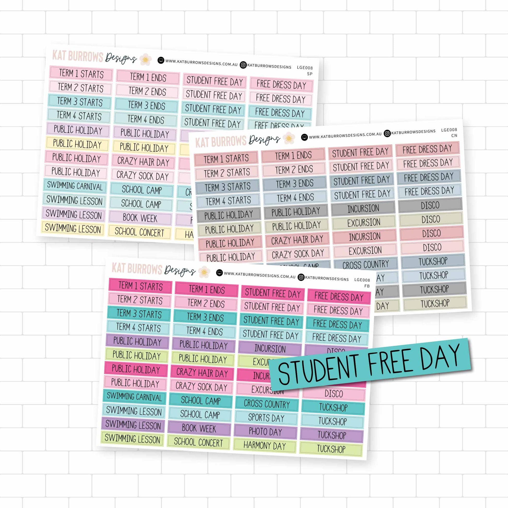 Fun and stylish Australian School header planner stickers featuring the words Term 1 Starts, Student Free Day, Free Dress Day, Public Holiday, Excursion, Disco, Book Week, Cross Country etc. These stickers are perfect for planners such as Erin Condren, Happy Planner, Kikki K etc.
