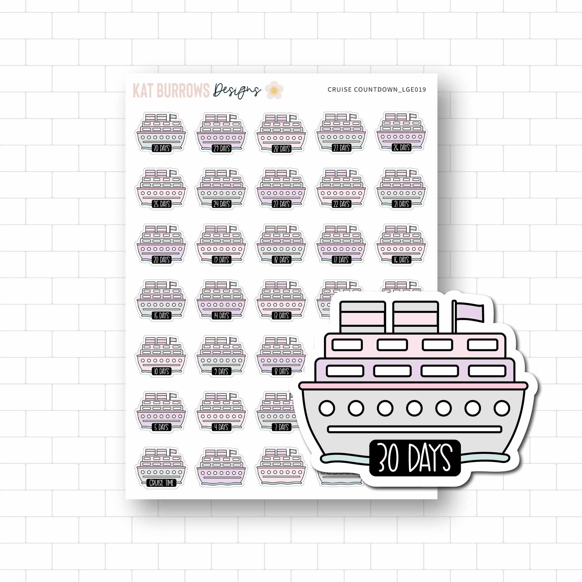 Fun and stylish planner stickers featuring a cruise ship with 30 countdown stickers and cruise icons. These stickers are perfect for planners such as Erin Condren, Happy Planner etc