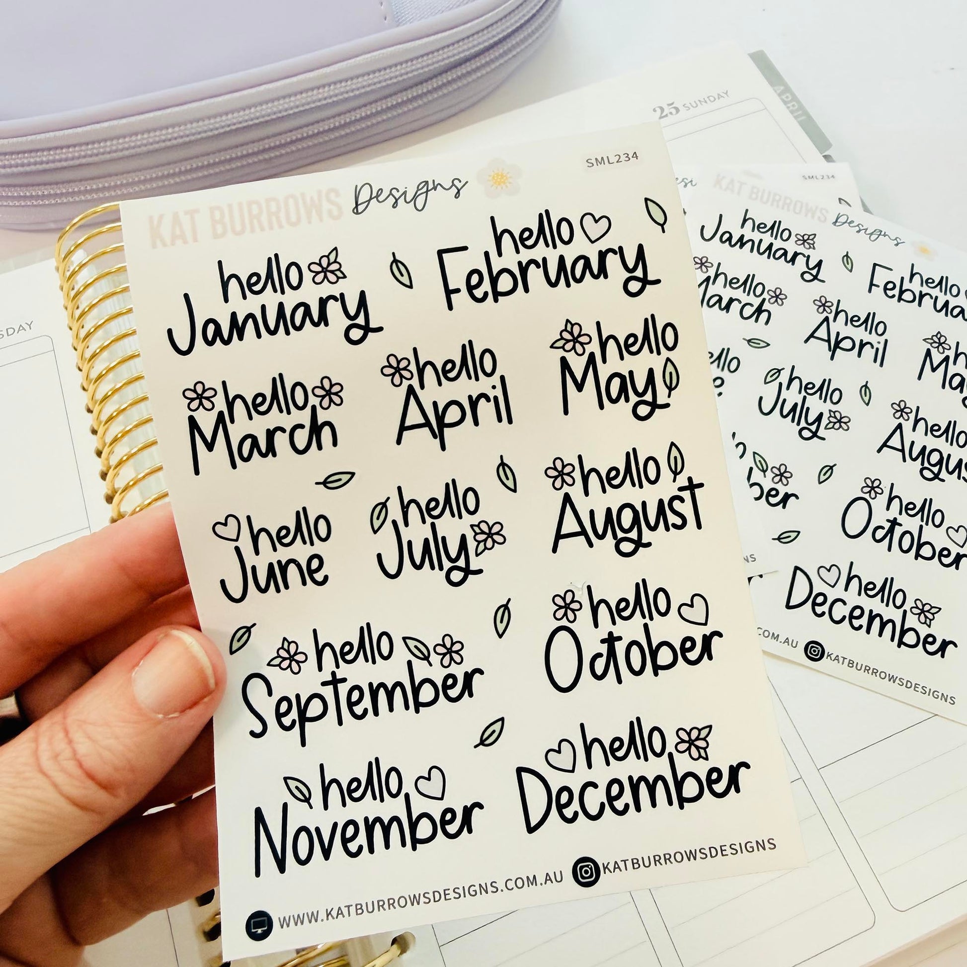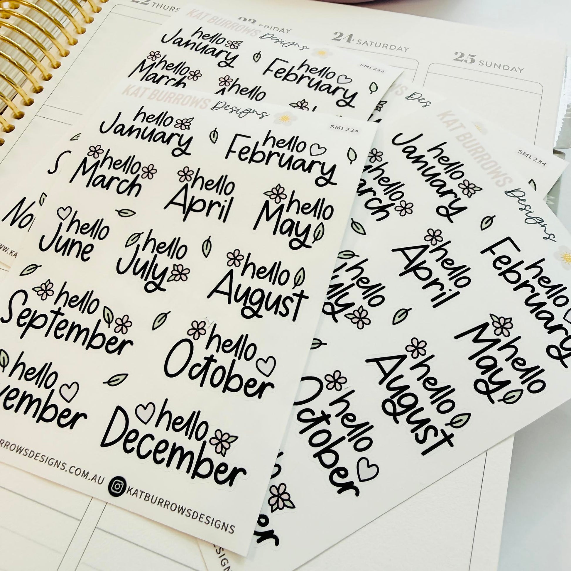 These beautiful monthly script stickers feature a flowing, elegant script font accented with delicate flowers, leaves, and hearts, perfect for adding a soft, decorative touch to your monthly planner pages.