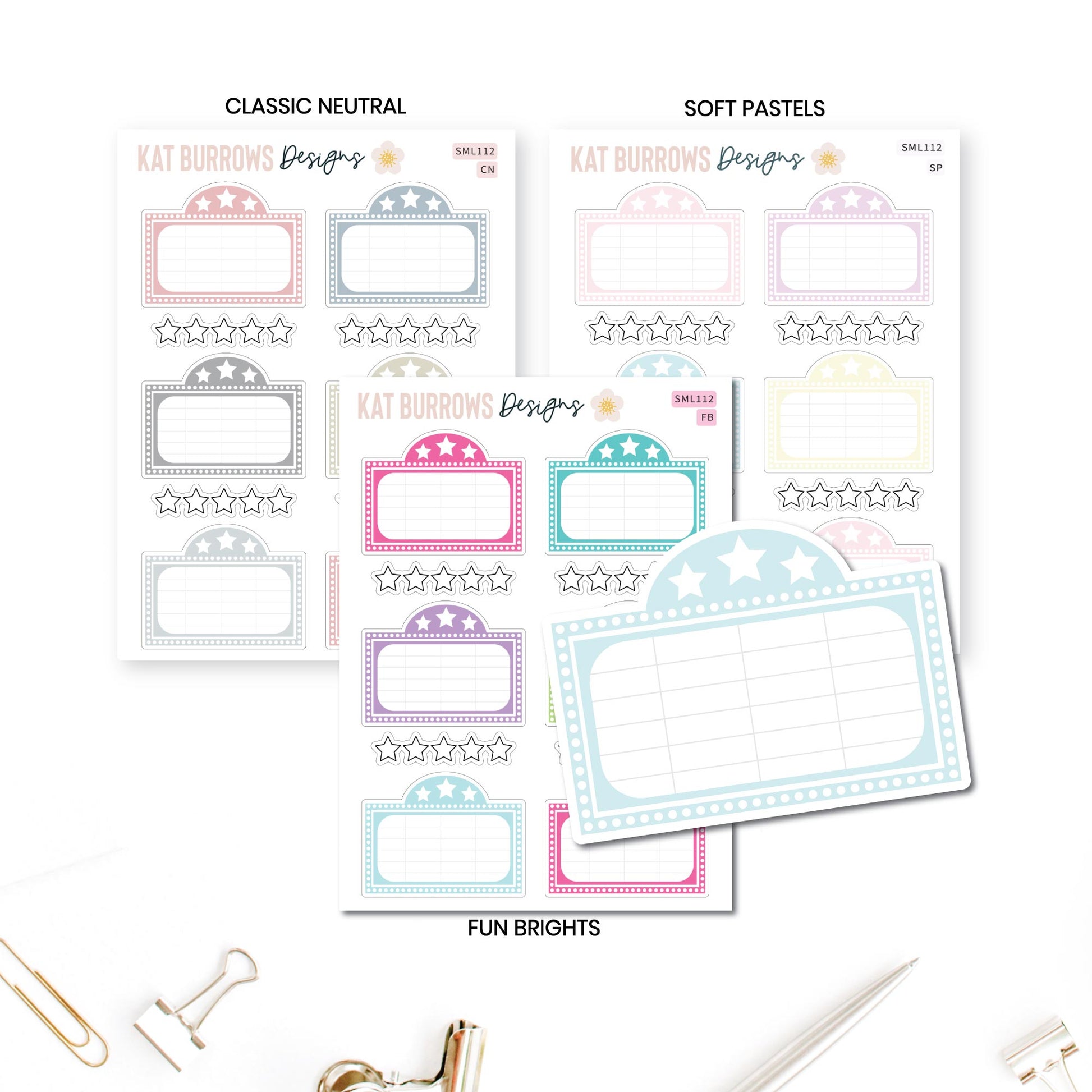 Fun and stylish planner stickers featuring Movie Marquees in assorted colours. These stickers are perfect for planners such as Erin Condren, The Happy Planner, Kikki K etc.