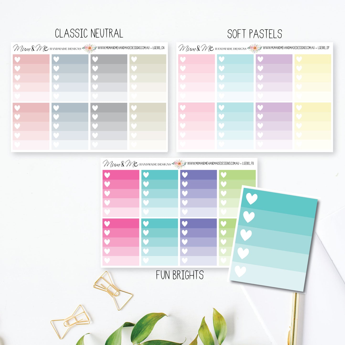 Super bright and functional planner stickers featuring 8 Heart Ombre Checklists. These stickers are perfect for vertical planners such as Erin Condren, Happy Planner, Kikki K etc.