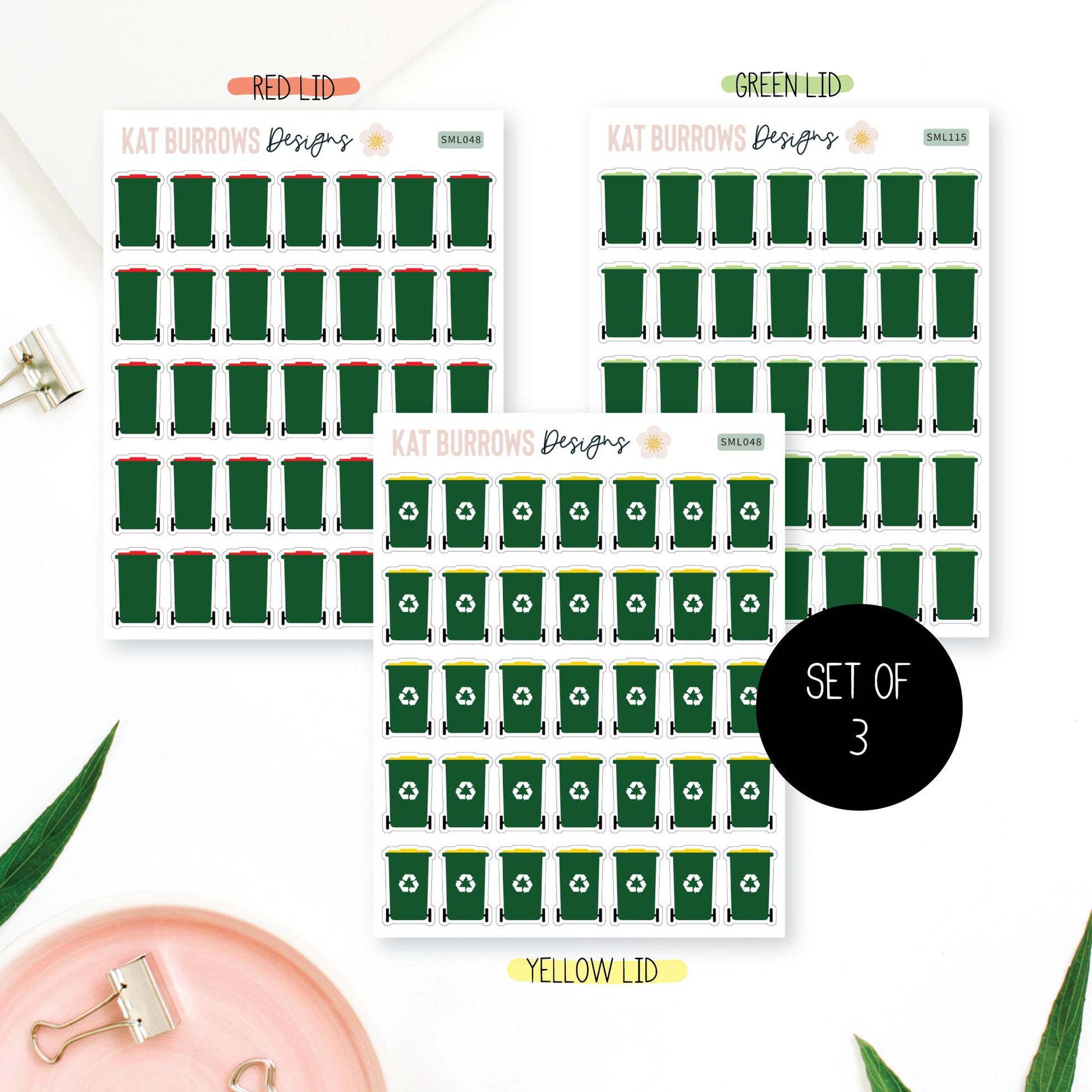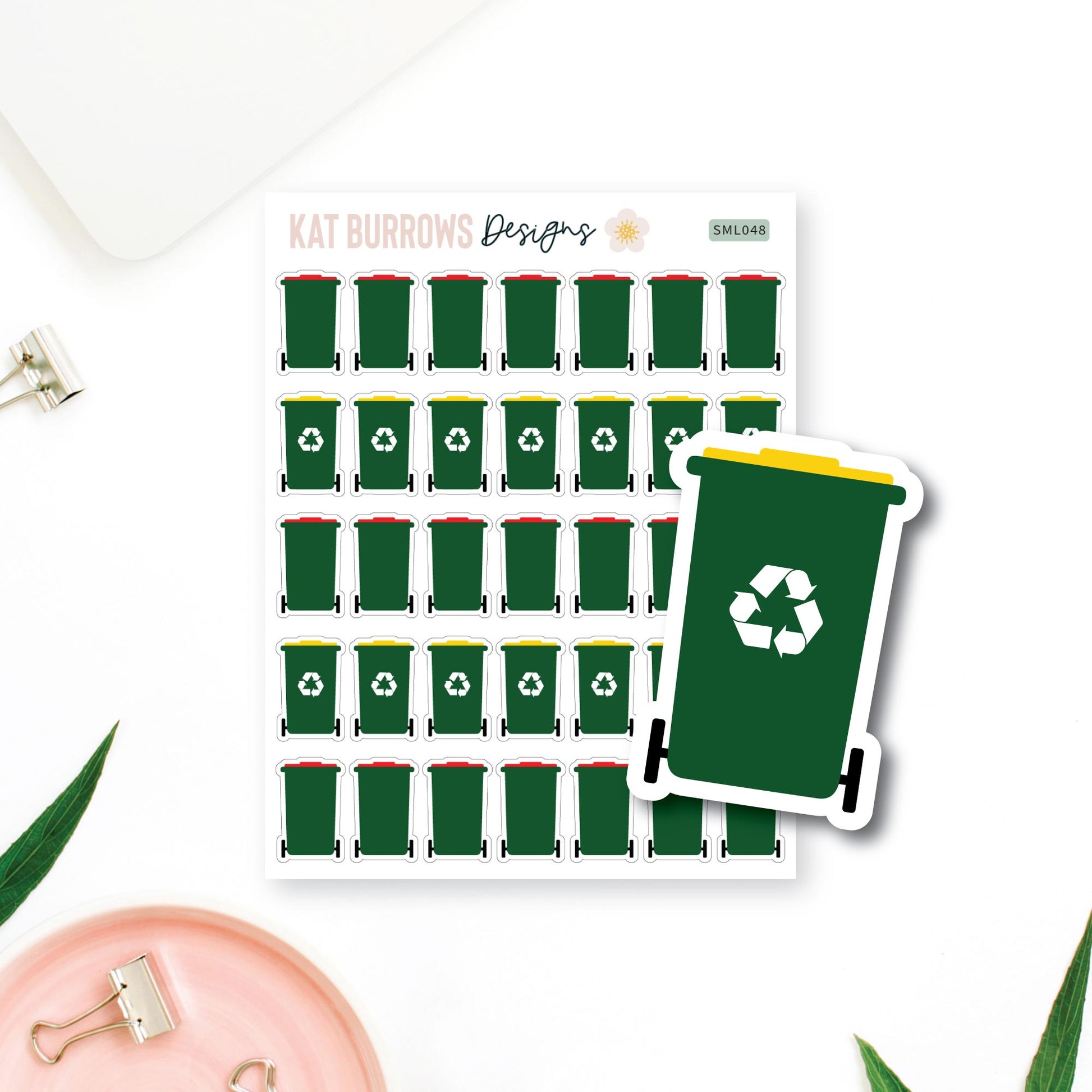 Fun and stylish planner stickers featuring wheelie bins and recycling bins. These stickers are perfect for planners such as Erin Condren, The Happy Planner, Kikki K etc.