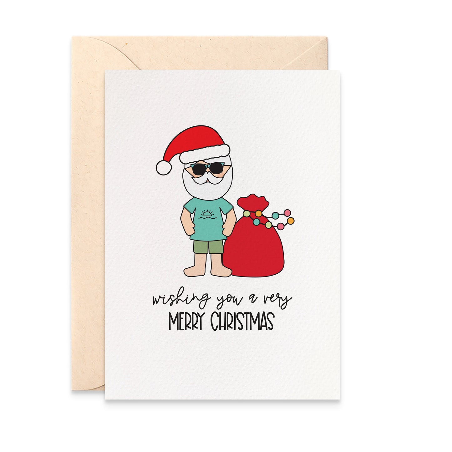 A fun handmade Australian Themed Christmas Card featuring a Summer Santa with the words Wishing you a very Merry Christmas. An fun card to celebrate this wonderful time of the year especially to friends and family overseas.