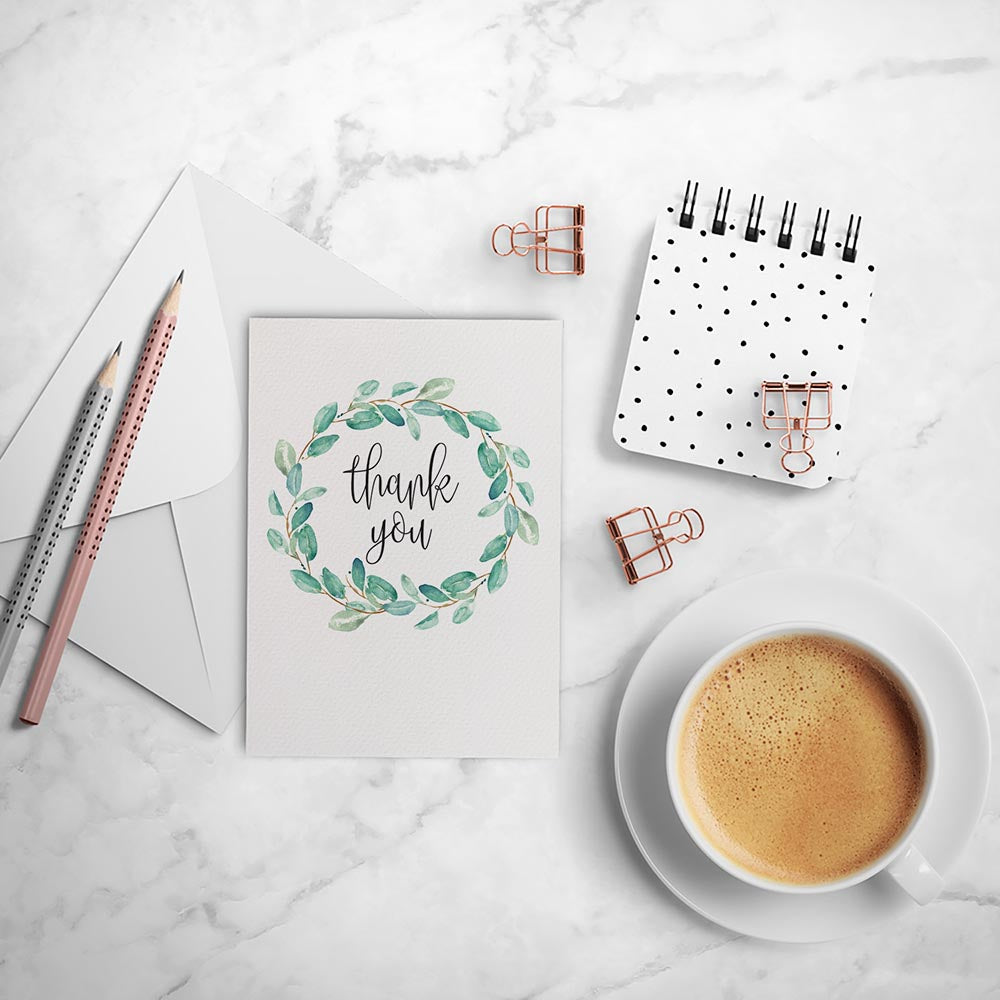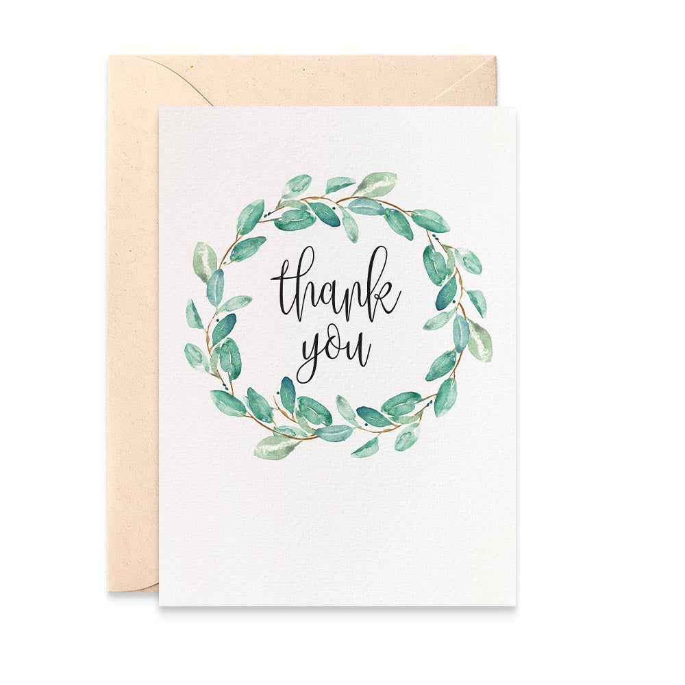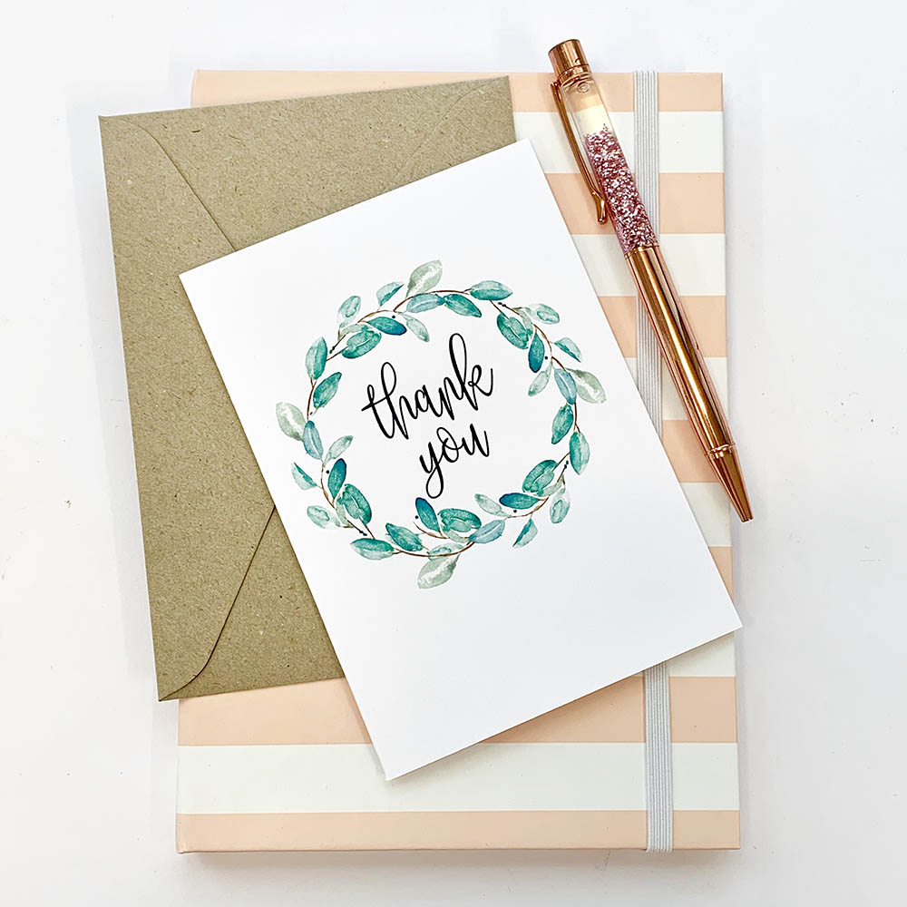 A beautiful handmade Thank You Card featuring a Eucalyptus Wreath with the words Thank You. A stylish and special card to send to someone to say Thank You. Perfect for Wedding Thank You Cards or Birthday Thank You Cards.