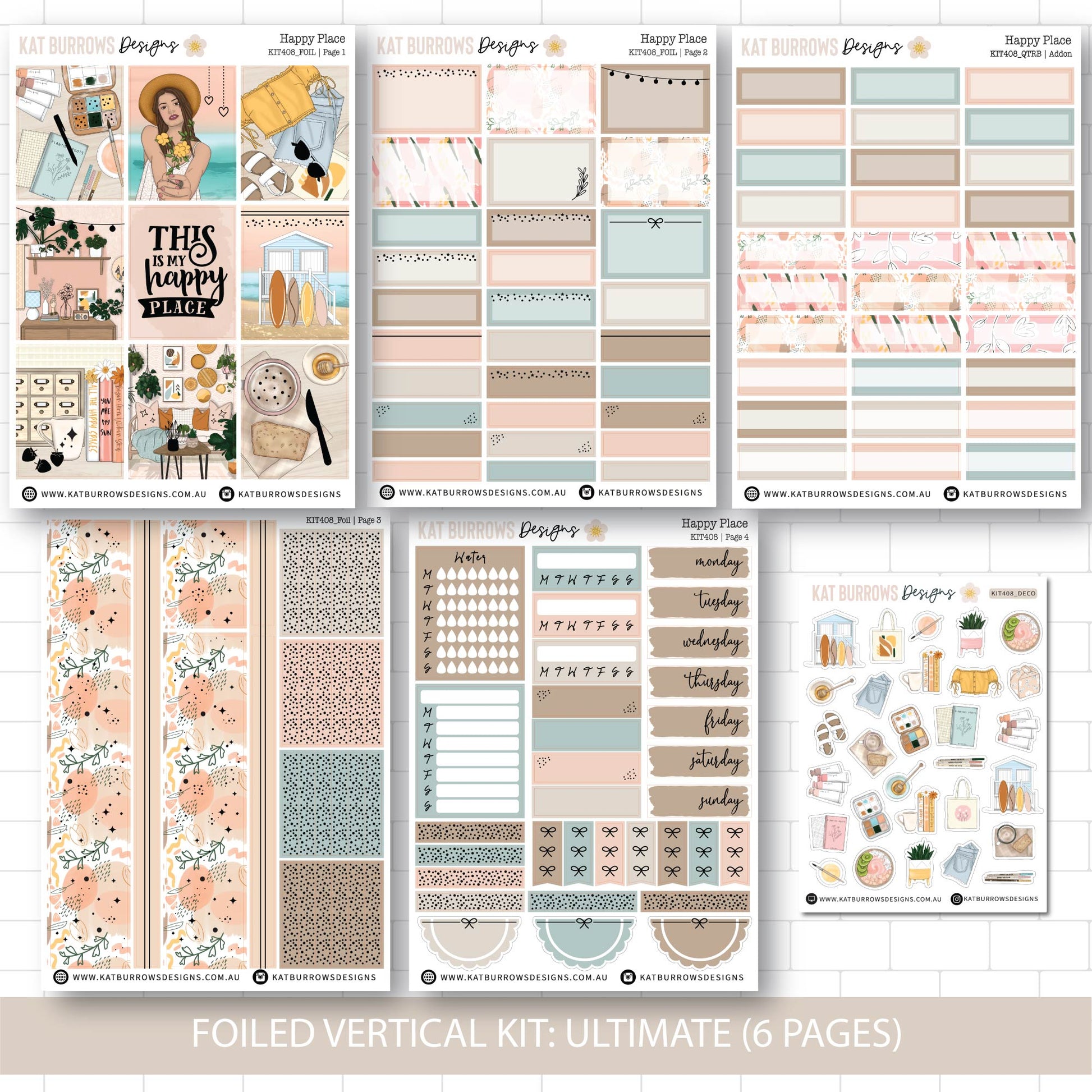 A beautiful foiled Ultimate Vertical Sticker Kit featuring a Happy Place theme. These foiled planner stickers are perfect for planners such as the Vertical Erin Condren Planner, The Happy Planner, Kikki K etc.