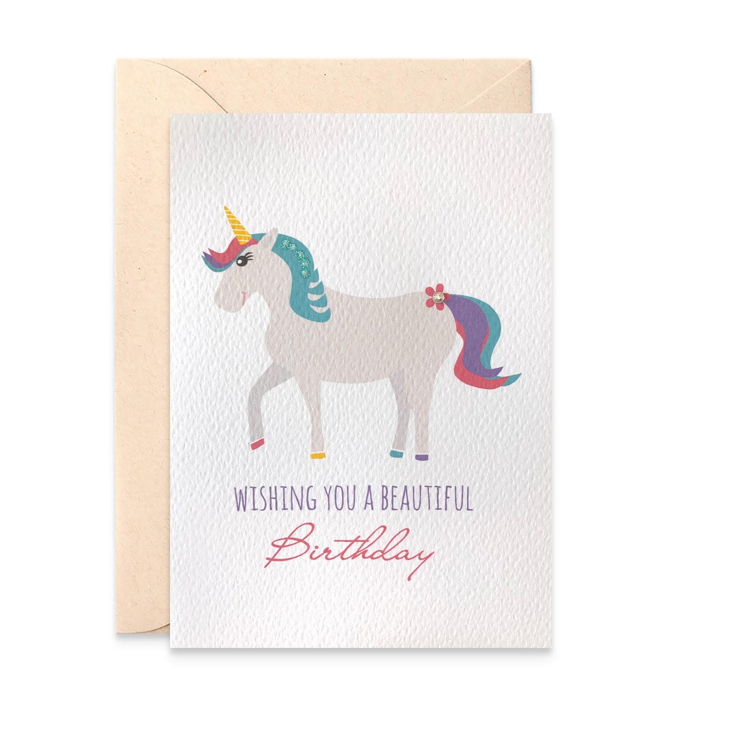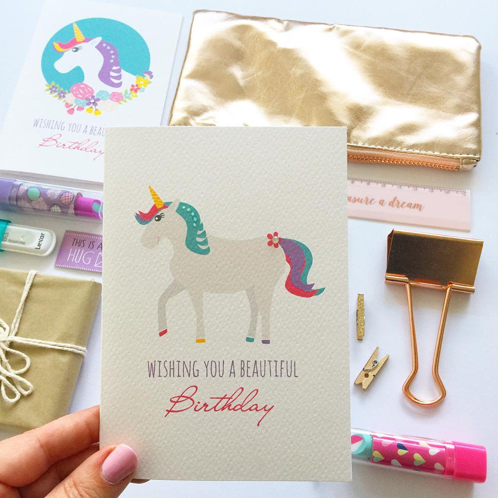 A cute and bright handmade Birthday Girl Card featuring a Unicorn. A fun greeting card to give to your daughters, nieces, cousins and school friends.