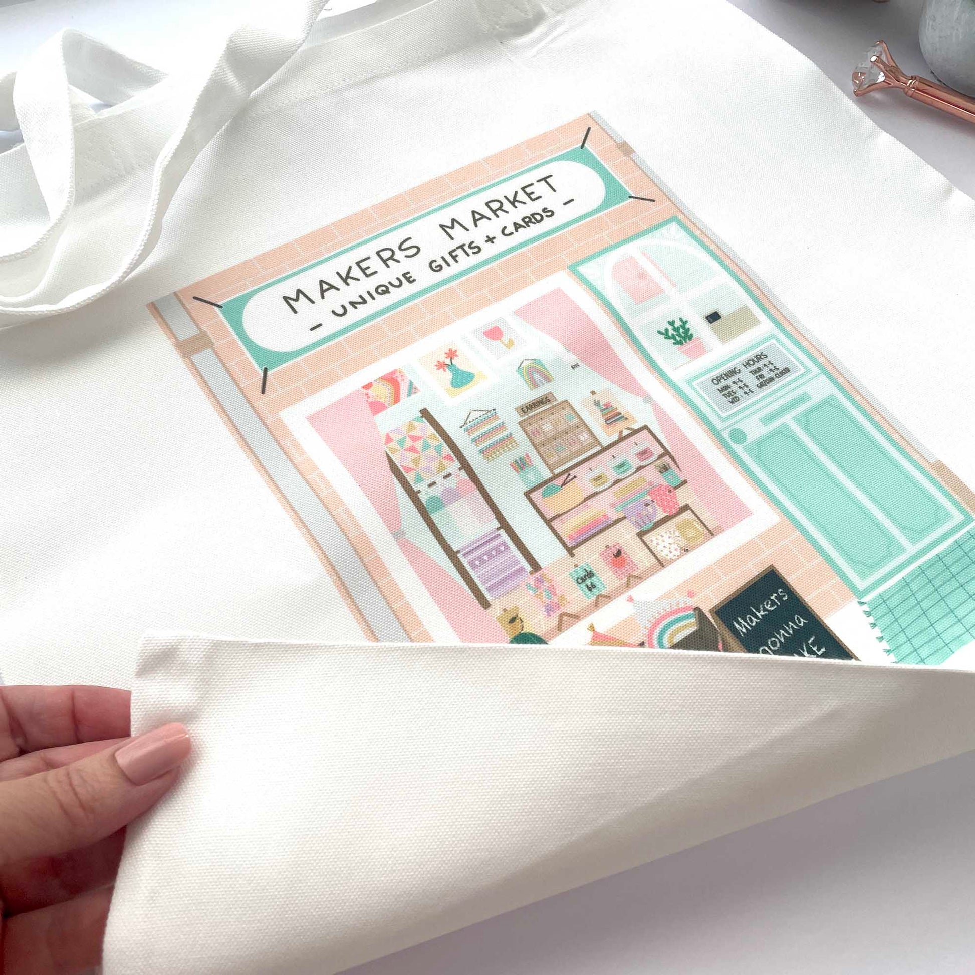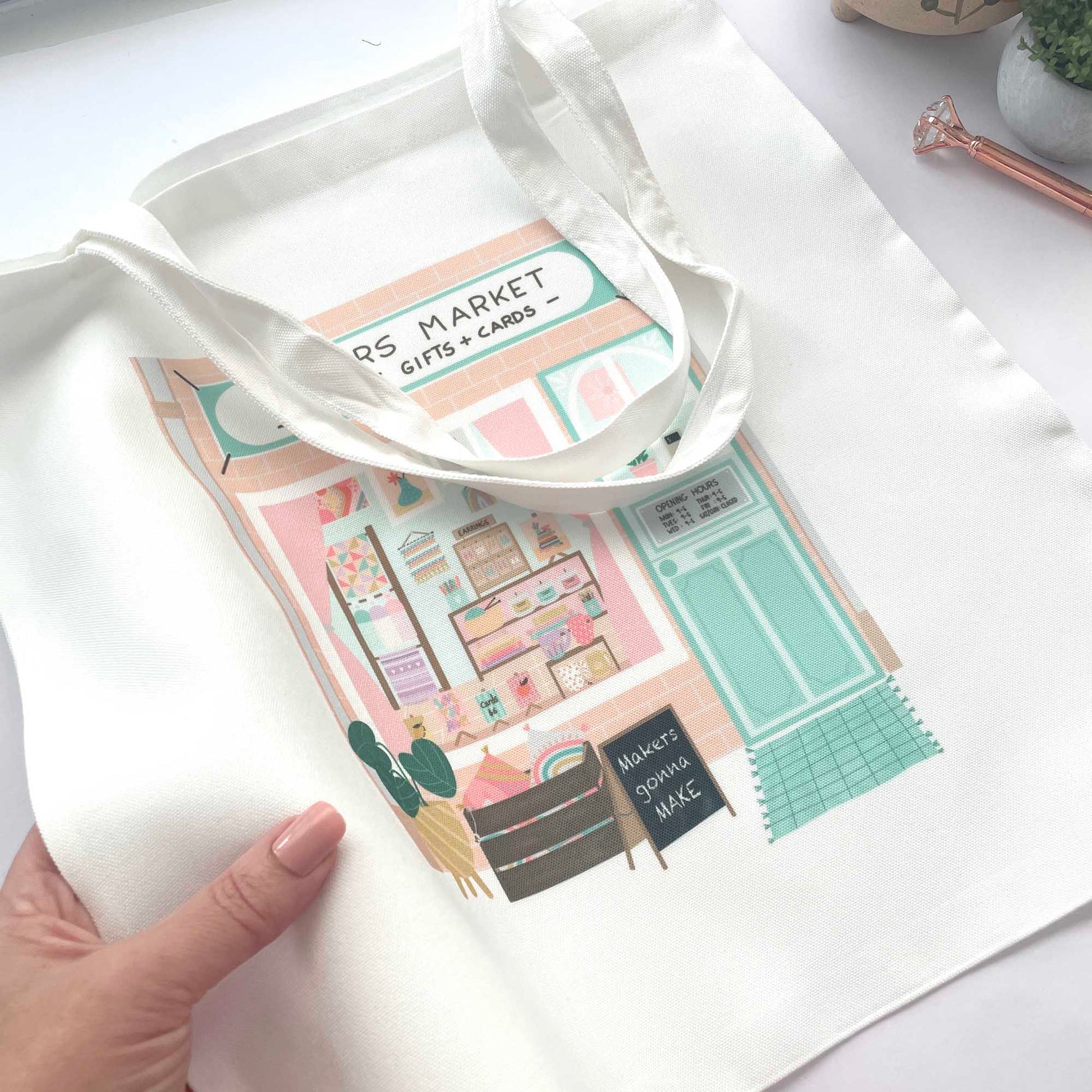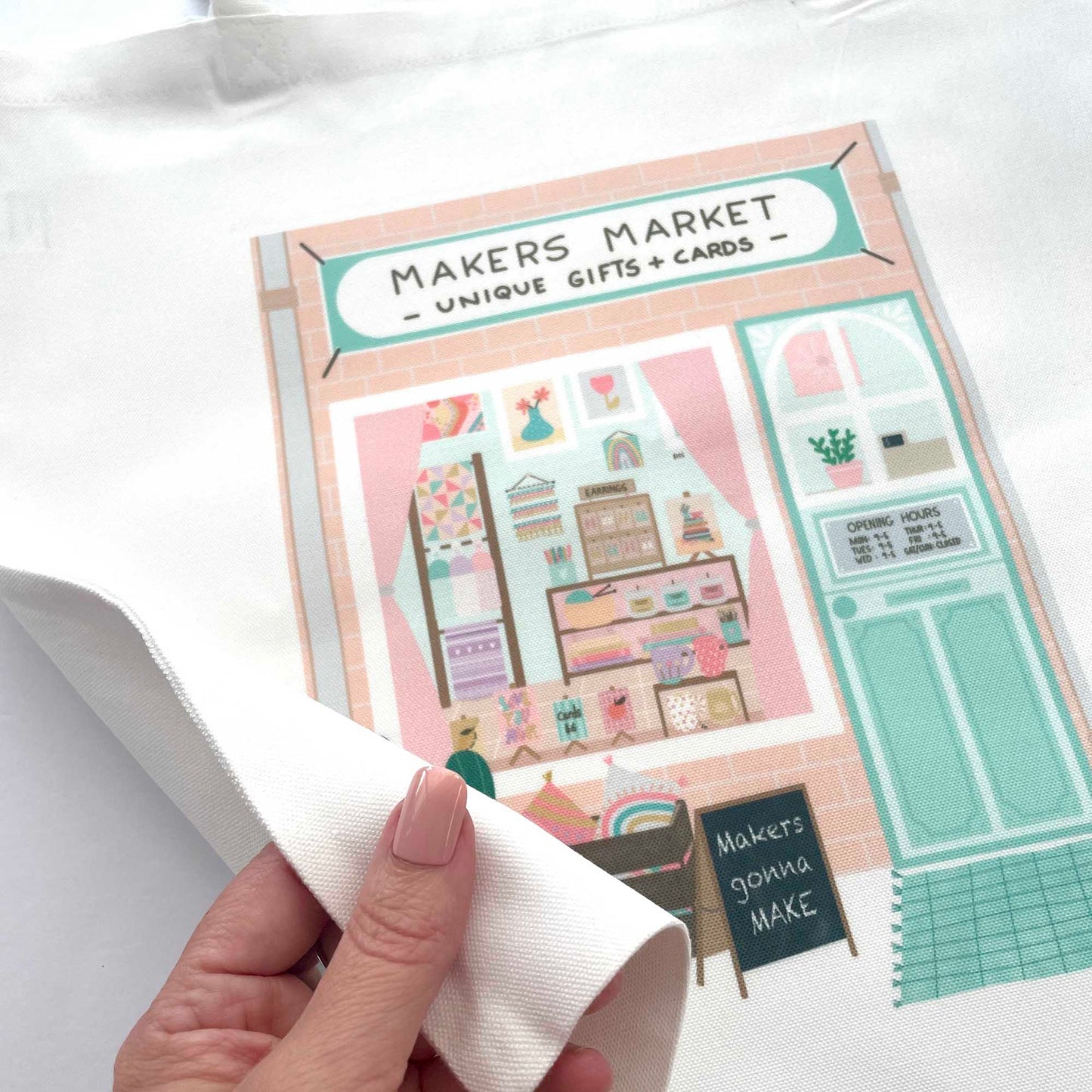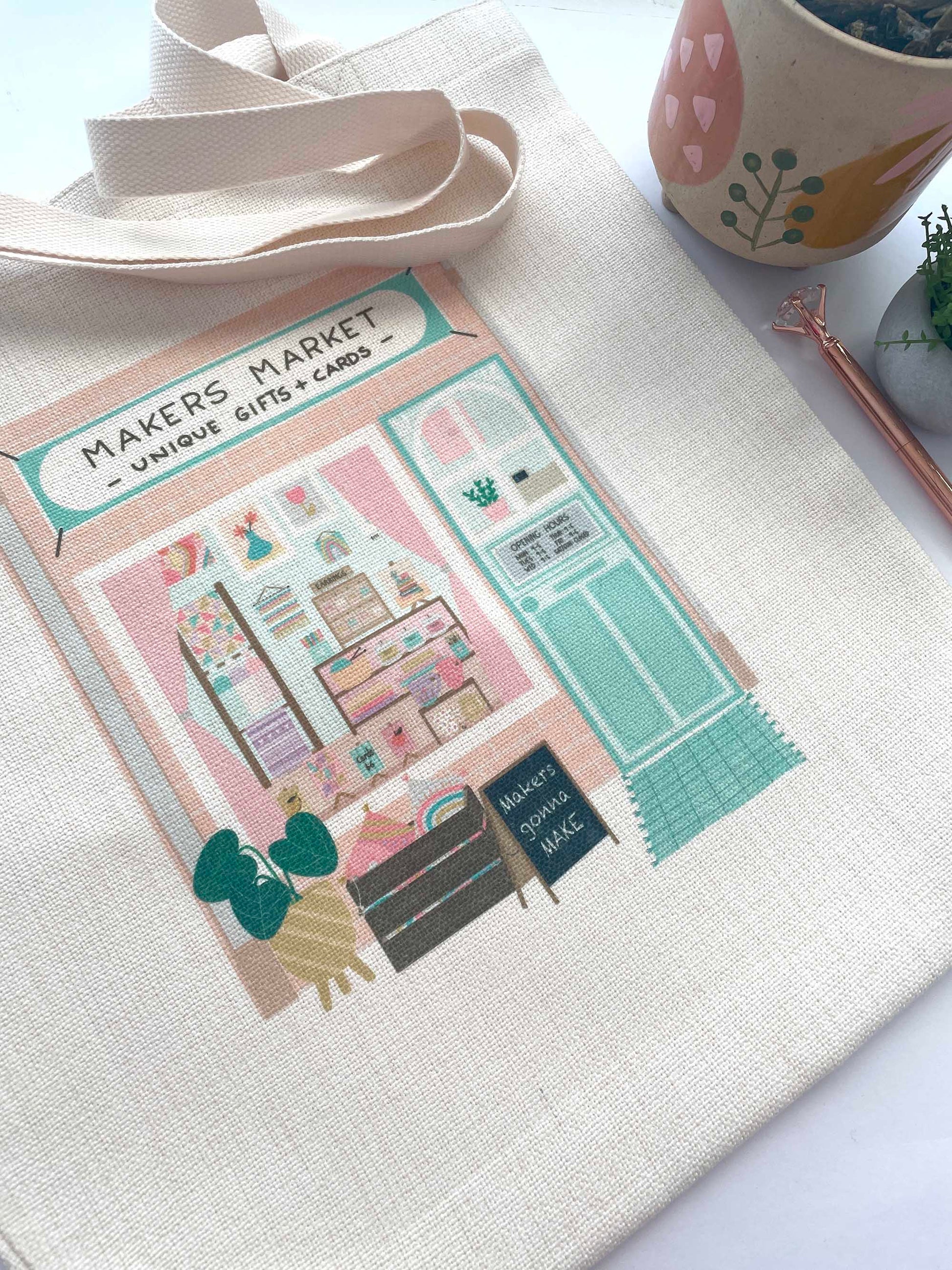 A gorgeous illustrated Tote Bag with a Makers Market Shop Theme perfect for the small business supporter.